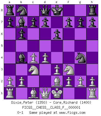 Last move : 0-1 2006 May 29 12:11:28 [Event "FICGS__CHESS__CLASS_F__000001"] [Site "FICGS"] [Date "2006.04.28"] [Round "1"] [White "Dixie,Peter"] [Black "Core,Richard"] [Result "0-1"] [WhiteElo "1350"] [BlackElo "1400"] 1.d4 b6 2.c4 Bb7 3.Nf3 e6 4.e3 Bb4+ 5.Nc3 Nf6 6.Be2 Ng4 0-1 Queen's pawn : English defense Player Black won this chess game. Follow this game move after move (download)My style is somewhere between that of Tal and Petrosian. (Reshevsky) Es ist besser die Steine des Gegners zu opfern. (Savielly Grigorievitsch Tartakower) Yo no creo en la psicología. Yo creo en las buenas movidas. (Bobby Fischer) Karpov est une pièce de musée. (Garry Kasparov) Now be brave and don't look back. Don't look back. (Shmi Skywalker in Star Wars ep.1)