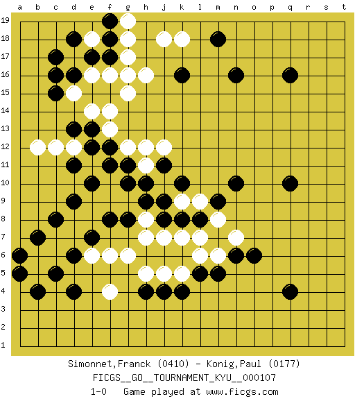 Last move : 1-0 2010 November 5 9:53:14 [Event "FICGS__GO__TOURNAMENT_KYU__000107"] [Site "FICGS"] [Date "2010.07.09"] [Round "1"] [Black "Simonnet,Franck"] [White "Konig,Paul"] [Result "1-0"] [Rating 1 "0410"] [Rating 2 "0177"] 1.d4 f6 2.d16 e14 3.f17 h16 4.q16 f16 5.e15 d15 6.f15 e16 7.e17 d17 8.c16 g16 9.d18 f14 10.c15 g15 11.d13 d12 12.e13 f13 13.e12 e11 14.f12 g12 15.f11 f10 16.g11 h11 17.g10 g9 18.h10 j10 19.h9 h8 20.j9 k9 21.j8 j7 22.k8 k7 23.l8 m8 24.k10 l9 25.j11 h12 26.d11 c12 27.e10 f9 28.g8 h7 29.f8 e9 30.d9 e8 31.e7 d8 32.c8 d7 33.d6 c7 34.b7 c6 35.c5 b6 36.a6 b5 37.b4 f4 38.q4 g17 39.q10 e18 40.c17 g18 41.f18 g19 42.f19 j18 43.n16 j12 44.k4 k5 45.h4 g6 46.n10 e6 47.a5 j5 48.j4 h5 49.l5 l6 50.m5 m6 51.n6 n7 52.o6 l7 53.m9 b12 54.m18 k18 55.k16 1-0 This go game has been lost on time (started : 2010.07.09 4:30:19) Here are the names of the openings (joseki) played in the four corners : Corner d4 : d4 f6 Hoshi (Hwajeom, Seongjeom, Xingwei`) 4-4 Point. The star or hoshi (4-4) point, emphasizing influence at the potential expense of territory. Corner d16 : d16 e14 Hoshi (Hwajeom, Seongjeom, Xingwei`) 4-4 Point. The star or hoshi (4-4) point, emphasizing influence at the potential expense of territory. Corner q4 : l8 m8 This joseki is unknown. A weak or weird move has probably been played in this corner. Player Black won this Go (weiqi, baduk) game. Follow this game move after move (download)To reduce an opponent's large prospective territory, strike at the shoulder. (Anonymous) If we don't succeed, we run the risk of failure. (George W. Bush)