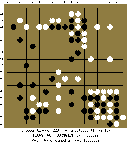 Last move : 0-1 2010 November 4 14:8:10 [Event "FICGS__GO__TOURNAMENT_DAN__000022"] [Site "FICGS"] [Date "2010.07.09"] [Round "1"] [Black "Brisson,Claude"] [White "Turlot,Quentin"] [Result "0-1"] [Rating 1 "2234"] [Rating 2 "2410"] 1.q4 d16 2.d3 p16 3.c5 r11 4.c14 f16 5.d10 j17 6.b16 c17 7.l4 r6 8.s5 s6 9.s4 p6 10.l11 r16 11.n17 m16 12.n16 n15 13.m15 l15 14.m14 n14 15.l16 m17 16.l17 m18 17.j16 l18 18.k16 h17 19.h16 g16 20.l14 o4 21.o3 p3 22.p4 p2 23.n3 r3 24.s3 r4 25.r5 q5 26.p5 q6 27.o5 r2 28.s2 s1 29.q3 q2 30.r1 t2 31.o2 o6 32.n5 n13 33.m12 o11 34.e13 e3 35.d2 e5 36.c7 j3 37.g3 g4 38.f3 f4 39.e2 j5 40.l6 j7 41.e7 k8 42.g6 j9 43.h8 m8 0-1 Here are the names of the openings (joseki) played in the four corners : Corner d16 : d16 c14 Hoshi (Hwajeom, Seongjeom, Xingwei`) 4-4 Point. The star or hoshi (4-4) point, emphasizing influence at the potential expense of territory. Ikken Kakari (Hankan Keolch'im, Yi Gua`jiao~, 1-Space Low Approach). Black 2 is the standard approach move to the 4-4. Player White won this Go (weiqi, baduk) game. Follow this game move after move (download)Strike at the waist of the knight's move. (Anonymous) Knowledge rests not upon truth alone, but upon error also. (Carl G. Jung)