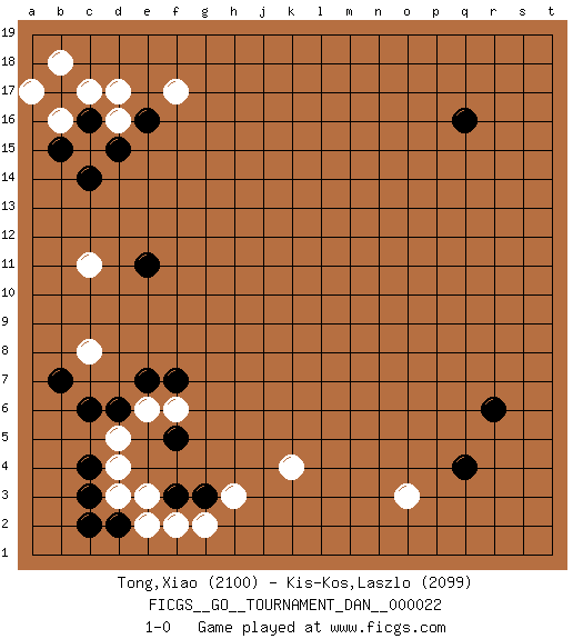 Last move : 1-0 2010 September 8 11:27:33 [Event "FICGS__GO__TOURNAMENT_DAN__000022 "] [Site "FICGS"] [Date "2010.07.09"] [Round "1"] [Black "Tong,Xiao "] [White "Kis-Kos,Laszlo "] [Result "1-0"] [Rating 1 "2100"] [Rating 2 "2099"] 1.q16 d4 2.q4 d16 3.f3 h3 4.c3 d3 5.c4 d5 6.d2 e2 7.c2 e3 8.c6 o3 9.r6 k4 10.c14 f17 11.d6 c11 12.f5 f2 13.c16 c17 14.b17 b18 15.d15 b16 16.b15 c15 17.g3 g2 18.c16 a17 19.e16 d17 20.e11 c8 21.b7 e6 22.e7 f6 23.f7 1-0 This go game has been lost on time (started : 2010.07.09 8:40:56) Here are the names of the openings (joseki) played in the four corners : Corner d4 : d4 f3Hoshi (Hwajeom, Seongjeom, Xingwei`) 4-4 Point. The star or hoshi (4-4) point, emphasizing influence at the potential expense of territory.Ikken Kakari (Hankan Keolch'im, Yi Gua`jiao~, 1-Space Low Approach). Black 2 is the standard approach move to the 4-4. Corner q4 : q4 o3Hoshi (Hwajeom, Seongjeom, Xingwei`) 4-4 Point. The star or hoshi (4-4) point, emphasizing influence at the potential expense of territory.Ikken Kakari (Hankan Keolch'im, Yi Gua`jiao~, 1-Space Low Approach). White 2 is the standard approach move to the 4-4. Corner d16 : d16 c14Hoshi (Hwajeom, Seongjeom, Xingwei`) 4-4 Point. The star or hoshi (4-4) point, emphasizing influence at the potential expense of territory.Ikken Kakari (Hankan Keolch'im, Yi Gua`jiao~, 1-Space Low Approach). Black 2 is the standard approach move to the 4-4. Player Black won this Go (weiqi, baduk) game.Follow this game move after move (download ) Answer the keima with a kosumi. (Anonymous) I fear not the man who has practiced 10,000 kicks once, but I fear the man who has practiced one kick 10,000 times. (Bruce Lee)