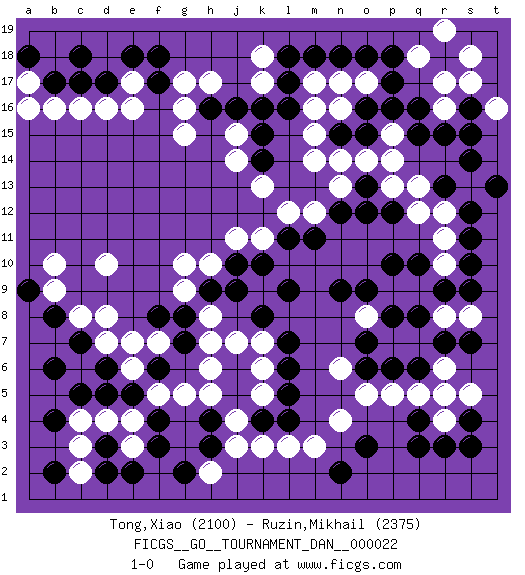 Last move : 1-0 2010 October 25 8:46:25 [Event "FICGS__GO__TOURNAMENT_DAN__000022"] [Site "FICGS"] [Date "2010.07.09"] [Round "1"] [Black "Tong,Xiao"] [White "Ruzin,Mikhail"] [Result "1-0"] [Rating 1 "2100"] [Rating 2 "2375"] 1.q16 d4 2.q4 d16 3.f3 c6 4.k4 d10 5.f17 h17 6.c17 c16 7.d17 e16 8.f18 g15 9.q10 o17 10.o15 n16 11.n15 m15 12.p17 m14 13.n12 l12 14.l11 m12 15.m11 n13 16.o13 k11 17.l9 p15 18.o12 o14 19.o18 p13 20.p12 q13 21.o16 n17 22.q15 p14 23.p16 n14 24.n18 m17 25.k10 j11 26.j10 h10 27.h9 g9 28.g8 g10 29.f8 h8 30.j9 h7 31.f6 q18 32.p18 r17 33.s16 r16 34.r15 s17 35.s14 s18 36.m18 t16 37.s15 r19 38.l17 m16 39.q3 k18 40.l18 s13 41.s12 r12 42.t13 r10 43.r13 q12 44.r9 q9 45.p10 r8 46.s9 s8 47.s10 r11 48.s11 r5 49.s4 r4 50.r3 s5 51.s3 p9 52.o9 o8 53.n9 p7 54.q6 q5 55.p6 p5 56.o6 o5 57.q8 q7 58.p8 r6 59.o7 n6 60.r7 m3 61.o3 n4 62.n2 k3 63.l4 l3 64.h3 j4 65.j5 j3 66.h4 k5 67.l5 k6 68.l6 k7 69.l7 h5 70.j6 h6 71.f4 f7 72.g7 f5 73.e5 g5 74.d5 e6 75.d6 e7 76.c5 d7 77.c7 c8 78.b6 d8 79.b8 b9 80.a9 b10 81.k16 j15 82.h16 g16 83.j16 g17 84.b17 b16 85.k15 j14 86.k14 k13 87.k8 j7 88.s7 k17 89.l16 e17 90.e18 a17 91.a18 a16 92.c18 c3 93.d2 e4 94.b4 c2 95.d3 e3 96.e2 c4 97.b2 h2 98.g2 1-0 Here are the names of the openings (joseki) played in the four corners : Corner d4 : d4 f3 Hoshi (Hwajeom, Seongjeom, Xingwei`) 4-4 Point. The star or hoshi (4-4) point, emphasizing influence at the potential expense of territory. Ikken Kakari (Hankan Keolch'im, Yi Gua`jiao~, 1-Space Low Approach). Black 2 is the standard approach move to the 4-4. Corner d16 : d16 f17 Hoshi (Hwajeom, Seongjeom, Xingwei`) 4-4 Point. The star or hoshi (4-4) point, emphasizing influence at the potential expense of territory. Ikken Kakari (Hankan Keolch'im, Yi Gua`jiao~, 1-Space Low Approach). Black 2 is the standard approach move to the 4-4. Corner q16 : q16 o17 Hoshi (Hwajeom, Seongjeom, Xingwei`) 4-4 Point. The star or hoshi (4-4) point, emphasizing influence at the potential expense of territory. Ikken Kakari (Hankan Keolch'im, Yi Gua`jiao~, 1-Space Low Approach). White 2 is the standard approach move to the 4-4. Player Black won this Go (weiqi, baduk) game. Follow this game move after move (download)Eyes win semiais. (Anonymous) Big Chess is a place for big hallucinations. (Thibault de Vassal)