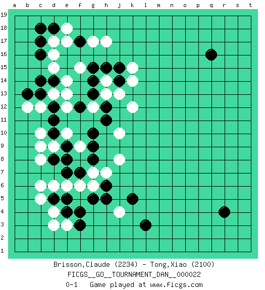 Last move : 0-1 2010 September 9 23:20:24 [Event "FICGS__GO__TOURNAMENT_DAN__000022"] [Site "FICGS"] [Date "2010.07.09"] [Round "1"] [Black "Brisson,Claude"] [White "Tong,Xiao"] [Result "0-1"] [Rating 1 "2234"] [Rating 2 "2100"] 1.q16 d4 2.r4 d16 3.f3 c6 4.f17 h17 5.c17 d17 6.c16 d15 7.d18 e18 8.c18 e17 9.c14 e3 10.f4 j4 11.e7 g6 12.e4 d3 13.d5 c5 14.h5 e6 15.e5 d6 16.g5 c12 17.d14 e14 18.d12 d13 19.c13 e13 20.d11 b12 21.b13 c10 22.d10 c9 23.h6 g7 24.g10 j8 25.l3 j10 26.h11 k12 27.g14 f15 28.j14 h13 29.g13 g12 30.h12 j13 31.f12 h14 32.g15 g17 33.h15 k14 34.j15 k15 35.g8 h7 36.f7 f6 37.d8 c8 38.k5 f9 39.g9 d9 40.e9 e10 41.e8 e12 0-1 Here are the names of the openings (joseki) played in the four corners : Corner d4 : d4 f3 Hoshi (Hwajeom, Seongjeom, Xingwei`) 4-4 Point. The star or hoshi (4-4) point, emphasizing influence at the potential expense of territory. Ikken Kakari (Hankan Keolch'im, Yi Gua`jiao~, 1-Space Low Approach). Black 2 is the standard approach move to the 4-4. Corner d16 : d16 f17 Hoshi (Hwajeom, Seongjeom, Xingwei`) 4-4 Point. The star or hoshi (4-4) point, emphasizing influence at the potential expense of territory. Ikken Kakari (Hankan Keolch'im, Yi Gua`jiao~, 1-Space Low Approach). Black 2 is the standard approach move to the 4-4. Player White won this Go (weiqi, baduk) game. Follow this game move after move (download)Don't make territory near thickness. (Anonymous) For a mechanic, you seem to do an excessive amount of thinking. (C-3PO in Star Wars ep.2)