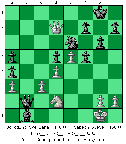 Last move : 0-1 2007 May 26 15:58:26 [Event "FICGS__CHESS__CLASS_C__000018"] [Site "FICGS"] [Date "2006.11.12"] [Round "1"] [White "Borodina,Svetlana"] [Black "Sabean,Steve"] [Result "0-1"] [WhiteElo "1700"] [BlackElo "1600"] 1.e4 c5 2.c3 d6 3.d4 Nf6 4.f3 e6 5.Be3 Be7 6.Bd3 d5 7.e5 Nfd7 8.f4 Nc6 9.Nf3 c4 10.Bc2 Qa5 11.O-O g6 12.Nbd2 b5 13.a3 Qc7 14.Qe1 Nb6 15.Bf2 Qd8 16.Bh4 Bxh4 17.Nxh4 a5 18.Qg3 Ra7 19.b4 cxb3 20.Nxb3 Na4 21.Nd2 Rc7 22.Bxa4 bxa4 23.Rfb1 Ba6 24.Rb6 Qc8 25.Rab1 O-O 26.f5 exf5 27.Nhf3 Nd8 28.Rb8 Qd7 29.Nh4 Bb7 30.Rb6 Ne6 31.Rxf8+ Kxf8 32.Qh3 Rc6 33.Rb2 Kg8 34.Nb1 Qc7 35.Nf3 Rb6 36.Rxb6 Qxb6 37.Nfd2 Ba6 38.Qh4 Qb2 39.Qe7 Bd3 40.Qd7 Bxb1 0-1 Sicilian : Alapin's variation (2.c3) Kingside Castling by player White (move 11) Kingside Castling by player Black (move 25) Player Black won this chess game. Follow this game move after move (download)Fischer is under obligation to nobody. (Joseph Platz) Je älter ich werde, um so mehr schätze ich die Bauern. (Paul Keres) Nunca nadie ha ganado una partida de Ajedrez rindiendose. (Unknown) Les ravages du H expliquent la différence de niveau entre Tal et Thal [Abergel]. Art is not a thing, it is a way. (Elbert Hubbard)