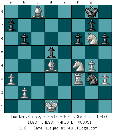 Last move : 1-0 2010 October 23 20:18:49 [Event "FICGS__CHESS__RAPID_E__000031"] [Site "FICGS"] [Date "2010.07.10"] [Round "1"] [White "Quanter,Kirsty"] [Black "Neil,Charlie"] [Result "1-0"] [WhiteElo "1054"] [BlackElo "1087"] 1.e4 e5 2.Nf3 Nf6 3.c3 Nxe4 4.Nxe5 Qe7 5.d4 d6 6.Nc4 Nxc3 7.Be2 Nxd1 8.Kxd1 d5 9.Ne3 c6 10.Bd3 Qh4 11.g3 Qh3 12.Bf1 Qh5+ 13.Be2 Qg6 14.a3 Bd6 15.Bd2 O-O 16.Nc3 Be6 17.f4 Nd7 18.g4 Bxf4 19.h3 Bg5 20.Na4 Nf6 21.Nc5 b6 22.Nxe6 Rfc8 23.Nxg5 Re8 24.Ng2 h6 25.Nf3 Ne4 26.Be1 Rac8 27.Ne5 Qe6 28.Rf1 f6 29.Nf4 Qd6 30.Neg6 c5 31.Bb5 Red8 32.Ba6 Rc7 33.Rc1 cxd4 34.Bb4 Rc5 35.Bxc5 Qb8 36.Bxd4 Ng3 37.Rf3 Rc8 38.Rxc8+ Qxc8 39.Bxc8 1-0 Petrov's defense Kingside Castling by player Black (move 15) Player White won this chess game. Follow this game move after move (download)Chess is a more highly symbolic game, but the aggressions are therefore even more frankly represented in the play. It probably began as a war game; that is, the representation of a miniature battle between the forces of two kingdoms. (Karl Meninger) Den Ruhm habe ich schon, jetzt brauche ich noch das Geld. (Wilhelm Steinitz) El Ajedrez es el gimnasio de la mente. (Blaise Pascal) La vérité est comme le meilleur coup aux échecs : elle existe, mais il faut la chercher. (Arturo Perez-Reverte) If you know the enemy and know yourself you need not fear the results of a hundred battles. (Sun Tzu)
