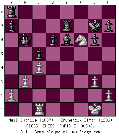 Last move : 0-1 2010 August 23 19:32:2 [Event "FICGS__CHESS__RAPID_E__000031"] [Site "FICGS"] [Date "2010.07.10"] [Round "1"] [White "Neil,Charlie"] [Black "Zaunercik,Ilmar"] [Result "0-1"] [WhiteElo "1087"] [BlackElo "1296"] 1.c4 c5 2.Nf3 Nc6 3.g3 Nf6 4.Bg2 d6 5.Nc3 g6 6.O-O Bg7 7.d4 cxd4 8.Nxd4 O-O 9.Nxc6 bxc6 10.e4 Bb7 11.Bg5 Qb6 12.b3 Ng4 13.Rc1 Bd4 14.Qxg4 f5 15.exf5 Rxf5 16.Bxe7 Bxf2+ 17.Kh1 c5 18.Rxf2 Rxf2 19.Qe6+ Rf7 20.Bd5 Bxd5+ 21.Kg1 Bxe6 22.Ne4 Rxe7 23.Nf6+ Kg7 0-1 English : Symmetrical variation Kingside Castling by player White (move 6) Kingside Castling by player Black (move 8) Player Black won this chess game. Follow this game move after move (download)My style is somewhere between that of Tal and Petrosian. (Reshevsky) Ich hatte Zahnschmerzen im ersten Spiel. In der zweiten Partie tat mir der Kopf weh. In der dritten war es eine Rheuma-Attacke und während der vierten fühlte ich mich nicht gut. Und in der fünften? Nun, man muss doch nicht jedes Spiel gewinnen, oder? (Savielly Grigorievitsch Tartakower) Me siento como si fuera una pieza en una partida de Ajedrez, cuando mi oponente me indica: esa pieza no puede ser movida. (Soren Kierkegaard) Si je n'étais pas joueur d'échecs, je serais le meilleur dans quelque chose d'autre. (Anatoli Karpov) Men should grow up. - Yeah. And dogs should stop licking themselves. It's not gonna happen. (Gregory House to Dr. Cameron, House M.D.)