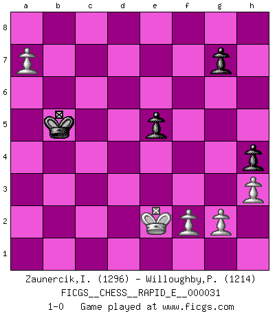 Last move : 1-0 2010 October 25 19:40:51 [Event "FICGS__CHESS__RAPID_E__000031"] [Site "FICGS"] [Date "2010.07.10"] [Round "1"] [White "Zaunercik,Ilmar"] [Black "Willoughby,Peter"] [Result "1-0"] [WhiteElo "1296"] [BlackElo "1214"] 1.e4 e5 2.Nf3 Nc6 3.Bb5 a6 4.Ba4 Nf6 5.O-O Be7 6.Re1 b5 7.Bb3 d6 8.c3 O-O 9.d3 Na7 10.Nbd2 c5 11.Nf1 Bg4 12.h3 Bxf3 13.Qxf3 a5 14.Ng3 a4 15.Bc2 Nc6 16.Nf5 b4 17.Bg5 Ne8 18.Bh6 Bg5 19.Qg4 Bxh6 20.Nxh6+ Kh8 21.Nf5 Rg8 22.Re3 Nf6 23.Qg3 Ne7 24.Qg5 Nxf5 25.Qxf5 Qd7 26.Qxd7 Nxd7 27.cxb4 cxb4 28.Rd1 a3 29.bxa3 Rxa3 30.Bb3 Rf8 31.d4 f6 32.dxe5 fxe5 33.Rxd6 Nc5 34.Rb6 Na6 35.Rd3 h5 36.Rd5 Re8 37.R5d6 Nc5 38.Bd5 Rc3 39.Rxb4 Nd3 40.Rb7 Nc5 41.Rc7 Nxe4 42.R6d7 Rxc7 43.Rxc7 Nf6 44.Bf7 Rd8 45.Bg6 Nd5 46.Ra7 Ne7 47.Rxe7 Kg8 48.Re8+ Rxe8 49.Bxe8 h4 50.a4 Kf8 51.Bb5 Ke7 52.a5 Kd6 53.a6 Kc7 54.Kf1 Kb6 55.Ke2 Kxb5 56.a7 1-0 Ruy Lopez : Closed Kingside Castling by player White (move 5) Kingside Castling by player Black (move 8) 10 pieces endgame at move 49 : White KBPPPP , Black KPPP WHITE : King + 1 Bishop 4 Pawns BLACK : King + 3 Pawns 9 pieces endgame at move 55 : White KPPPP , Black KPPP WHITE : King + 4 Pawns BLACK : King + 3 Pawns Player White won this chess game. Follow this game move after move (download)I have always a slight feeling of pity for the man who has no knowledge of Chess. (Siegbert Tarrasch) Gott hat gewollt, dass ich Champion werde. (Surab Azmajparaschvili) Alekhine es un poeta que crea un trabajo de arte de algo que raramente inspiraría a otra persona a mandar una tarjeta postal. (Max Euwe) Des idées, des idées, j'en ai cent, j'en ai mille. Des bonnes, des mauvaises, applicables, irréalisables... Il suffit de faire le tri ! (Roos) Knowledge will give you power, but character respect. (Bruce Lee)