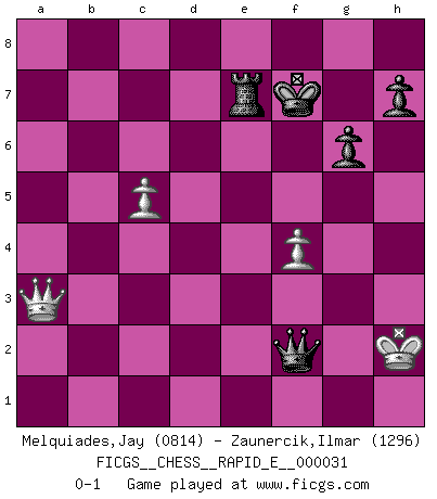 Last move : 0-1 2010 September 10 18:0:47 [Event "FICGS__CHESS__RAPID_E__000031"] [Site "FICGS"] [Date "2010.07.10"] [Round "1"] [White "Melquiades,Jay"] [Black "Zaunercik,Ilmar"] [Result "0-1"] [WhiteElo "0814"] [BlackElo "1296"] 1.e4 c5 2.Nf3 d6 3.Nc3 Nc6 4.a3 Nf6 5.h3 g6 6.d3 Bg7 7.Bg5 O-O 8.Nd5 Nxd5 9.exd5 Ne5 10.Nxe5 dxe5 11.h4 Qxd5 12.h5 f6 13.h6 fxg5 14.hxg7 Kxg7 15.f3 Qd4 16.Be2 Qxb2 17.Rb1 Qxa3 18.O-O a5 19.Rb3 Qa4 20.d4 exd4 21.Bb5 Qa2 22.Rf2 Be6 23.Rd3 Qd5 24.c4 Qd6 25.Re2 Bf5 26.Rb3 d3 27.Rd2 e5 28.Rbxd3 Bxd3 29.Rxd3 Qe6 30.Bd7 Qe7 31.Qa1 Rfd8 32.Qa4 b6 33.Qb5 Ra7 34.Qxb6 R8xd7 35.Re3 Rd6 36.Qxc5 Re6 37.Qb5 a4 38.c5 Qb7 39.Qc4 Qc6 40.Qc3 Kf6 41.g3 a3 42.f4 gxf4 43.gxf4 Kf7 44.Rxe5 Rxe5 45.Qxe5 Re7 46.Qc3 Qf6 47.Qxa3 Qd4+ 48.Kh2 Qf2+ 0-1 Sicilian Kingside Castling by player Black (move 7) Kingside Castling by player White (move 18) 10 pieces endgame at move 45 : White KQPP , Black KQRPPP WHITE : King + 1 Queen 2 Pawns BLACK : King + 1 Queen 1 Rook 3 Pawns 9 pieces endgame at move 47 : White KQPP , Black KQRPP WHITE : King + 1 Queen 2 Pawns BLACK : King + 1 Queen 1 Rook 2 Pawns Player Black won this chess game. Follow this game move after move (download)It is not enough to be a good player... you must also play well. (Siegbert Tarrasch) Es ist wirklich schade, dass so viele Schachspieler nicht auf ihr Äußeres achten! (Alexandra Kosteniuk) El Ajedrez es un regaderazo frío para la mente. (Sir John Simon) Le temps de noter son nom sur la feuille de partie, j'étais déjà en zeitnot ! D'un modeste amateur apparié lors de la première ronde d'un open contre le grand-maître Azmaïparashvili. To err is human, but to really foul things up requires a computer. (Farmer's Almanac, 1978)