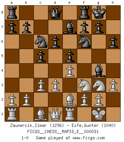 Last move : 1-0 2010 September 1 22:59:7 [Event "FICGS__CHESS__RAPID_E__000031"] [Site "FICGS"] [Date "2010.07.10"] [Round "1"] [White "Zaunercik,Ilmar"] [Black "Eife,Gunter"] [Result "1-0"] [WhiteElo "1296"] [BlackElo "1040"] 1.e4 c5 2.Nf3 d6 3.c3 e5 4.Be2 Nf6 5.d3 h6 6.O-O Be7 7.Nbd2 Nc6 8.Re1 O-O 9.Nf1 Be6 10.Ng3 Bg4 11.h3 1-0 This chess game has been lost on time (started : 2010.07.10 0:57:54) Sicilian Kingside Castling by player White (move 6) Kingside Castling by player Black (move 8) Player White won this chess game. Follow this game move after move (download)Some part of a mistake is always correct. (Savielly Tartakover) Die Auseinandersetzung mit Karpow war politisch geprägt. Er stand für das kommunistische System, wurde von dessen Repräsentanten gehätschelt. Ich war der Oppositionelle. Jeder Schachweltmeister spiegelt auch die gesellschaftlichen Verhältnisse wider. Kramnik steht für die Börsen-Generation des Neuen Markts, ideologiefrei, zahlenfixiert. (Garry Kasparov) El Ajedrez es parte de la cultura, y si una cultura esta en decadencia, entonces también el Ajedrez declinará. (Mikhail Botvinnik) Les Echecs sont et restent toujours un combat, un combat intégral comme la boxe, la lutte ou un autre sport, et où il doit y avoir un vainqueur et un vaincu. (Joseph Emil Diemer) A good teacher is like a candle - it consumes itself to light the way for others. (Author unknown)