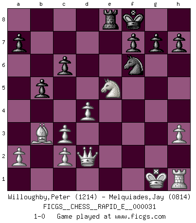 Last move : 1-0 2010 July 17 19:0:39 [Event "FICGS__CHESS__RAPID_E__000031"] [Site "FICGS"] [Date "2010.07.10"] [Round "1"] [White "Willoughby,Peter"] [Black "Melquiades,Jay"] [Result "1-0"] [WhiteElo "1214"] [BlackElo "0814"] 1.e4 e5 2.f4 exf4 3.Bc4 d5 4.Bxd5 Qh4+ 5.Kf1 Nf6 6.Nf3 Qh5 7.Nc3 c6 8.Bb3 b5 9.d4 Bb4 10.Bxf4 Bxc3 11.bxc3 Nxe4 12.Qd3 Bf5 13.Re1 O-O 14.Rxe4 Nd7 15.Qe2 Nf6 16.Bd6 Bxe4 17.Bxf8 Rxf8 18.h3 Re8 19.Ne5 Bxg2+ 20.Qxg2 Qd1+ 21.Kf2 Qd2+ 22.Kg1 Kf8 23.Qxd2 1-0 KGA : Bishop's gambit, Bledow variation Kingside Castling by player Black (move 13) Player White won this chess game. Follow this game move after move (download)If cunning alone were needed to excel, women would be the best Chess players. (Albin) Das Schachspiel ist ein See, in welchem eine Mücke baden und ein Elefant ertrinken kann. (Emanuel Lasker) Solo los afeminados hacen el Enroque. (Rob Sillars) Le pion, dans sa simplicité, marche droit devant lui, mais lorsqu'il prend, il le fait obliquement? Ainsi l'homme, tant qu'il reste pauvre, marche dans la droiture et vit honnêtement, mais lorsqu'il recherche les honneurs, il flatte, se parjure et, par les voies obliques, cherche une position supérieure sur l'échiquier du monde. (Jean de Galles) Don't be discouraged. It's often the last key in the bunch that opens the lock. (Author unknown)