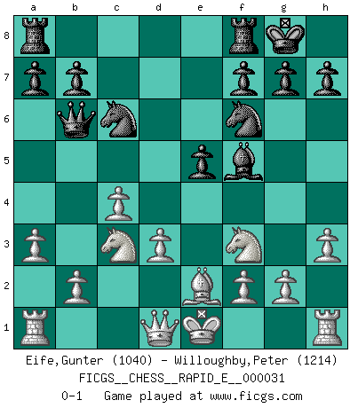 Last move : 0-1 2010 August 22 10:43:56 [Event "FICGS__CHESS__RAPID_E__000031"] [Site "FICGS"] [Date "2010.07.10"] [Round "1"] [White "Eife,Gunter"] [Black "Willoughby,Peter"] [Result "0-1"] [WhiteElo "1040"] [BlackElo "1214"] 1.e4 d5 2.exd5 Nf6 3.c4 c6 4.dxc6 Nxc6 5.d3 e5 6.Nf3 Bg4 7.Be2 Bb4+ 8.Bd2 O-O 9.Bxb4 Nxb4 10.a3 Nc6 11.h3 Bf5 12.Nc3 Qb6 0-1 This chess game has been lost on time (started : 2010.07.10 0:57:54) Scandinavian gambit Kingside Castling by player Black (move 8) Player Black won this chess game. Follow this game move after move (download)During a Chess competition a Chessmaster should be a combination of a beast of prey and a monk. (Alexander Alekhine) Ich hatte meine größten Erfolge, als ich 47 Jahre alt war. Kasparow war noch nicht mal 42 und hat das Schach schon im Stich gelassen. (Viktor Kortschnoi) Los asuntos humanos son como una partida de Ajedrez: solo aquellos que no lo toman seriamente, pueden ser llamados buenos jugadores. (Hung Tzu Ch'eng) Ce qui caractérise les parties de combat, c'est que si le défenseur a constamment de difficiles problèmes à résoudre, l'attaquant doit chercher sans relâche de nouvelles possibilités d'attaque. (Koblentz) It's not enough to succeed. Others must fail. (Gore Vidal)