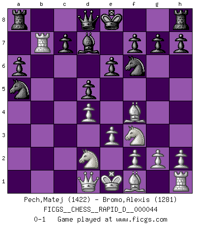 Last move : 0-1 2010 September 17 20:57:11 [Event "FICGS__CHESS__RAPID_D__000044"] [Site "FICGS"] [Date "2010.07.10"] [Round "1"] [White "Pech,Matej"] [Black "Bromo,Alexis"] [Result "0-1"] [WhiteElo "1422"] [BlackElo "1281"] 1.d4 d5 2.Nf3 e6 3.Bf4 Nc6 4.e3 Nf6 5.Nbd2 Bb4 6.c3 Ba5 7.a4 Bd7 8.b4 Bxb4 9.cxb4 Nxb4 10.a5 a6 11.Rb1 Nc6 12.Rxb7 Nxa5 0-1 This chess game has been lost on time (started : 2010.07.10 1:1:47) Queen's pawn game Player Black won this chess game. Follow this game move after move (download)All I want to do, ever, is just play Chess. (Bobby Fischer) Wer nie einen Fehler gemacht hat, hat nie etwas Neues ausprobiert. (Albert Einstein) En partidas rápidas, el Caballo es mas poderoso que el Alfil. (Vlastimil Hort) Pour moi, les échecs ne sont pas un jeu mais un art. (Alexandre Alekhine) Wisdom begins at the end. (Daniel Webster)