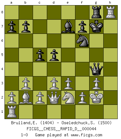 Last move : 1-0 2010 September 22 9:0:34 [Event "FICGS__CHESS__RAPID_D__000044"] [Site "FICGS"] [Date "2010.07.10"] [Round "1"] [White "Brulland,Emmanuel"] [Black "Oseledchuck,Sergey"] [Result "1-0"] [WhiteElo "1404"] [BlackElo "1500"] 1.b3 d5 2.g3 c5 3.d3 e5 4.Bb2 Nc6 5.Bg2 Nf6 6.Nd2 Be6 7.e3 Be7 8.Ne2 O-O 9.O-O Qd7 10.Nf3 Bh3 11.Nxe5 Nxe5 12.Bxe5 Bxg2 13.Kxg2 h5 14.Nf4 h4 15.h3 Qf5 16.Bb2 g5 17.Ne2 g4 18.hxg4 h3+ 19.Kxh3 Qxg4+ 20.Kg2 Kg7 21.Rh1 Rh8 22.Qd2 Rag8 23.Rxh8 1-0 This chess game has been lost on time (started : 2010.07.10 1:1:47) Nimzovich-Larsen attack : Classical variation Kingside Castling by player Black (move 8) Kingside Castling by player White (move 9) Player White won this chess game. Follow this game move after move (download)It is no time to be playing Chess when the house is on fire. (Italian Proverb) Alle Schachspieler sollten auch ein Hobby haben. (Savielly Grigorievitsch Tartakower) Cuando tu casa esta en llamas, no puedes ser molestado por tus vecinos. O, como decinos en Ajedrez, si tu Rey esta bajo ataque, no te preocupa perder un Peón del lado de la Reina. (Gary Kasparov) Les sacrifices démontrent seulement que quelqu'un a gaffé. (Savielly Tartacover) It's unlucky to be superstitious. (Dave Enteles)