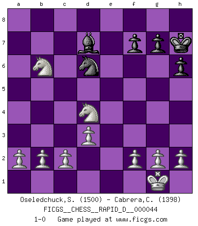 Last move : 1-0 2010 September 6 14:52:5 [Event "FICGS__CHESS__RAPID_D__000044"] [Site "FICGS"] [Date "2010.07.10"] [Round "1"] [White "Oseledchuck,Sergey"] [Black "Cabrera,Claudio"] [Result "1-0"] [WhiteElo "1500"] [BlackElo "1398"] 1.e4 e5 2.Nf3 Nc6 3.Bb5 Nf6 4.d3 h6 5.Bxc6 bxc6 6.Nxe5 Bb7 7.O-O d5 8.Re1 Bd6 9.Nf3 Be7 10.exd5 cxd5 11.Qe2 Bc8 12.Nd4 Bd7 13.Bf4 Kf8 14.Bxc7 Qe8 15.Nc3 Bc5 16.Qxe8+ Rxe8 17.Rxe8+ Bxe8 18.Nb3 Bb6 19.Bd6+ Kg8 20.Bc5 Kh7 21.Bxb6 axb6 22.Nd4 Bd7 23.Re1 Re8 24.Rxe8 Nxe8 25.Nxd5 Nd6 26.Nxb6 1-0 Ruy Lopez : Berlin defense Kingside Castling by player White (move 7) Player White won this chess game. Follow this game move after move (download)Chess makes man wiser and clear-sighted. (Vladimir Putin) Bobby Fischer ist kein Vorbild für die heutige Jugend. (Viktor Kortschnoi) Fischer es una tragedia del Ajedrez Americano a la par con Morphy y Pillsbury. (Mig Greengard) Karpov est une pièce de musée. (Garry Kasparov) We cannot be sure of having something to live for unless we are willing to die for it. (Ernesto Che Guevara)