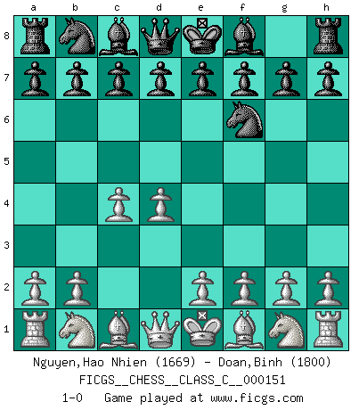 Last move : 1-0 2010 July 18 2:35:54 [Event "FICGS__CHESS__CLASS_C__000151"] [Site "FICGS"] [Date "2010.07.11"] [Round "1"] [White "Nguyen,Hao Nhien"] [Black "Doan,Binh"] [Result "1-0"] [WhiteElo "1669"] [BlackElo "1800"] 1.d4 Nf6 2.c4 1-0 Queen's pawn game Player White won this chess game. Follow this game move after move (download)Chess is like war on a board. (Bobby Fischer) Ich verstehe Aljechins Kombinationen ganz gut; aber woher er diese Angriffschancen bekommt und wie er die Eröffnung behandelt das ist für mich ein Buch mit sieben Siegeln. (Rudolf Spielmann) El jugador blanco perdió porque fallo en recordar la coreccta continuación y tuvo que pensar por sí mismo las movidas. (Siegbert Tarrasch) Le plus grand jeu de l'esprit jamais inventé, plus vous l'apprenez, plus vous y prenez du plaisir. (Garry Kasparov) The Movers & Shakers of this world are those who play chess in the mornings and go to the disco in the evenings. (Dinesh De Silva)