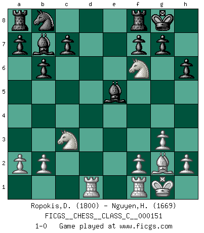 Last move : 1-0 2010 August 3 14:53:29 [Event "FICGS__CHESS__CLASS_C__000151"] [Site "FICGS"] [Date "2010.07.11"] [Round "1"] [White "Ropokis,Dimitrios"] [Black "Nguyen,Hao Nhien"] [Result "1-0"] [WhiteElo "1800"] [BlackElo "1669"] 1.Nf3 d5 2.g3 Nf6 3.Bg2 e6 4.O-O Bd6 5.d4 O-O 6.c4 b6 7.Nc3 Bb7 8.Bg5 h6 9.Bxf6 Qxf6 10.cxd5 exd5 11.e4 dxe4 12.Nd2 Qxd4 13.Ndxe4 Qxd1 14.Raxd1 Be5 15.Nf6+ 1-0 Reti : King's Indian attack (Barcza system) Kingside Castling by player White (move 4) Kingside Castling by player Black (move 5) Player White won this chess game. Follow this game move after move (download)Chess is a forcing house where the fruits of character can ripen more fully than in life. (Edward Morgan Foster) Besser ein falscher Plan, logisch durchgeführt, als gar kein Plan. (Viktor Kortschnoi) Tu no necesitas jugar muy bien, únicamente ayudar a tu oponenet a que juegue muy mal. (Genrikh Chepukaitis) Avant la finale, les dieux ont créé le milieu de partie. (Tarrasch) Logic : The art of thinking and reasoning in strict accordance with the limitations and incapacities of the human misunderstanding. (Ambrose Bierce)