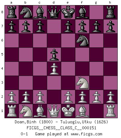 Last move : 0-1 2010 July 18 2:38:16 [Event "FICGS__CHESS__CLASS_C__000151"] [Site "FICGS"] [Date "2010.07.11"] [Round "1"] [White "Doan,Binh"] [Black "Tuluoglu,Utku"] [Result "0-1"] [WhiteElo "1800"] [BlackElo "1626"] 1.Nf3 d5 2.d4 Nf6 0-1 Reti Opening Player Black won this chess game. Follow this game move after move (download)Chess is not like life... it has rules ! (Mark Pasternak) Ich habe die Schachforschung dermaßen betrieben, dass sie auf eine wissenschaftliche Basis gestellt wurde. (Mikhail Moiseyevich Botvinik) El Ajedrez no es una pizca de inferior al violín, y tenemos un gran número de violinistas profesionales. (Mikhail Botvinnik) Le système Elo représente seulement une moyenne. Il est simplement un indicateur de votre stabilité. (Anatoli Karpov) If you know the enemy and know yourself you need not fear the results of a hundred battles. (Sun Tzu)