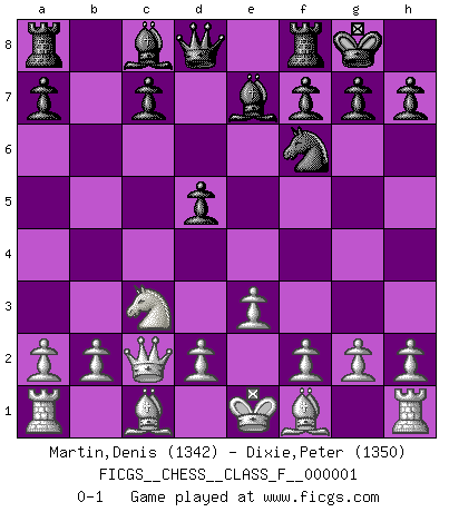 Last move : 0-1 2006 June 16 10:56:38 [Event "FICGS__CHESS__CLASS_F__000001"] [Site "FICGS"] [Date "2006.04.28"] [Round "1"] [White "Martin,Denis"] [Black "Dixie,Peter"] [Result "0-1"] [WhiteElo "1342"] [BlackElo "1350"] 1.Nf3 d5 2.c4 e5 3.Nxe5 Nc6 4.Nxc6 bxc6 5.Qc2 Nf6 6.e3 Be7 7.Nc3 O-O 8.cxd5 cxd5 0-1 This chess game has been lost on time (started : 2006.04.28 18:34:14) Reti Opening Kingside Castling by player Black (move 7) Player Black won this chess game. Follow this game move after move (download)Chess is 99 percent tactics. (Teichmann) Das Schach ist nichts für kleine Geister, es beansprucht einen vollen Mann, der sich nicht sklavisch an das Überlieferte hält, sondern selbständig die Tiefen des Spiels zu ergründen sucht. (Wilhelm Steinitz) Cualquier cambio de material en una posición debe venir por medio de un mate, una captura o promoción de Peón. (Purdy) Le jeu d'échecs fait naître et fortifie en nous plusieurs qualités précieuses dans le cours de l'existence, telles que la prévoyance, la circonspection, la prudence, et la persévérance. (Benjamin Franklin - 1783, la morale des échecs) Perhaps the current trend of many chess professionals taking up the more lucrative pastime of poker is not a wholly negative one. It may not be too late for humans to relearn how to take risks in order to innovate and thereby maintain the advanced lifestyles we enjoy. And if it takes a poker-playing supercomputer to remind us that we can't enjoy the rewards without taking the risks, so be it. (The Chess Master and the Computer, by Garry Kasparov - 2010)