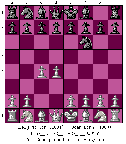 Last move : 1-0 2010 July 27 0:13:17 [Event "FICGS__CHESS__CLASS_C__000151"] [Site "FICGS"] [Date "2010.07.11"] [Round "1"] [White "Kiely,Martin"] [Black "Doan,Binh"] [Result "1-0"] [WhiteElo "1691"] [BlackElo "1800"] 1.d4 Nf6 2.c4 1-0 Queen's pawn game Player White won this chess game. Follow this game move after move (download)You have to have the fighting spirit. You have to force moves and take chances. (Bobby Fischer) Der vorletzte Fehler gewinnt. (Savielly Grigorievitsch Tartakower) Yo creo que el Ajedrez posee una magia que es también una ayuda en la edad avanzada. Una rodilla reumática es olvidada durante una partida de Ajedrez y otros eventos pueden parecer algo sin importancia comparada a una catástrofe en el tablero de Ajedrez. (Vlastimil Hort) Le temps de noter son nom sur la feuille de partie, j'étais déjà en zeitnot ! D'un modeste amateur apparié lors de la première ronde d'un open contre le grand-maître Azmaïparashvili. Computers make it easier to do a lot of things, but most of the things they make it easier to do don't need to be done. (Andy Rooney)