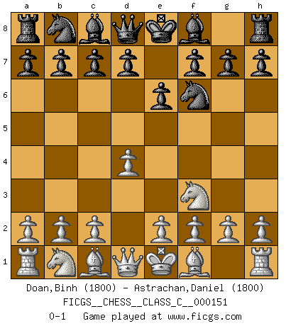 Last move : 0-1 2010 July 27 0:13:42 [Event "FICGS__CHESS__CLASS_C__000151"] [Site "FICGS"] [Date "2010.07.11"] [Round "1"] [White "Doan,Binh"] [Black "Astrachan,Daniel"] [Result "0-1"] [WhiteElo "1800"] [BlackElo "1800"] 1.Nf3 Nf6 2.d4 e6 0-1 Reti Opening Player Black won this chess game. Follow this game move after move (download)Botvinnik tried to take the mystery out of Chess, always relating it to situations in ordinary life. He used to call Chess a typical inexact problem similar to those which people are always having to solve in everyday life. (Garry Kasparov) Über Karpov: Er war und ist ein Vertreter der russischen Reaktionäre. Das steckt tief in seiner Seele, wehalb ich nicht nett mit ihm umgehen kann. (Viktor Kortschnoi) En un gambito tu regalas un Peón por el bién de tomar un juego perdido. (Samuel Standige Boden) Les échecs sont un jeu par leur forme, un art par leur essence et une science par sa difficulté d'acquisition. Ils peuvent vous procurer autant de plaisir qu'un bon livre ou une belle musique, mais vous n'aurez une réelle joie que si vous arrivez à bien jouer. (Tigran Petrosian) Wisdom doesn't necessarily come with age. Sometimes age just shows up all by itself. (Tom Wilson)