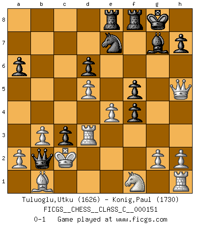 Last move : 0-1 2010 August 13 1:38:57 [Event "FICGS__CHESS__CLASS_C__000151"] [Site "FICGS"] [Date "2010.07.11"] [Round "1"] [White "Tuluoglu,Utku"] [Black "Konig,Paul"] [Result "0-1"] [WhiteElo "1626"] [BlackElo "1730"] 1.e4 c5 2.Nf3 Nc6 3.d4 cxd4 4.Nxd4 Nf6 5.Nc3 e6 6.Ndb5 d6 7.Bf4 e5 8.Bg5 a6 9.Na3 b5 10.Bxf6 gxf6 11.Nd5 f5 12.Bd3 Be6 13.c3 Bg7 14.Nc2 Bxd5 15.exd5 Ne7 16.f3 O-O 17.Ne3 e4 18.Bc2 f4 19.Nf1 b4 20.fxe4 bxc3 21.b3 Qb6 22.Qh5 Rae8 23.O-O-O Qc5 24.Bb1 Qa3+ 25.Kc2 f5 26.Rd3 Qb2+ 0-1 Sicilian defense Kingside Castling by player Black (move 16) Queenside Castling by player White (move 23) Player Black won this chess game. Follow this game move after move (download)It's always better to sacrifice your opponent's men. (Savielly Tartakover) Der Vorposten provoziert a) eine Basis für neue Angriffe und b) eine Schwächung der gegnerischen Widerstandskraft in der fraglichen Linie. (Aaron Nimzowitsch) Sin errores no puede haber brillantez. (Emanuel Lasker) Il n'y a plus de joueurs du niveau de Jacob Murray dont la seule quête est le beau jeu, le plaisir de voir les pièces construire quelque chose. Sur 10 idées à la minute, 9 seront sans intérêt, la dernière s'avèrera géniale. (Christian Bauer) Never was anything great achieved without danger. (Niccolo Machiavelli)