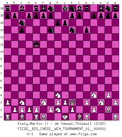 Last move : 0-1 2010 August 26 10:51:7 [Event "FICGS__BIG_CHESS__WCH_TOURNAMENT_01__000001"] [Site "FICGS"] [Date "2010.07.11"] [Round "1"] [White "Kiely,Martin"] [Black "de Vassal,Thibault"] [Result "0-1"] [WhiteElo ""] [BlackElo "2192"] 1.q2-q3 j15-k13 2.a2-a3 h16-o10 3.b1-c3 o10-f2 4.g1-f3 f2-l7 5.j2-h4 l7-l2 6.k1-l3 l2-o5 7.p2-p4 o5-o2 8.l3-n4 o2-e11 9.m2-m3 m15-m13 10.p1-o3 h15-g13 11.o1-p2 c15-c13 12.h1-k3 b16-c14 0-1 This big chess game has been lost on time (started : 2010.07.11 0:50:7) Follow this game move after move (download)I have always a slight feeling of pity for the man who has no knowledge of Chess. (Siegbert Tarrasch) Jeder Schachmeister war einmal ein Anfänger. (Irving Chernev) La señal de un Gran Maestro es su habilidad de ganar una partida rápidamente y sin dolor. (Irving Chernev) Le système Elo représente seulement une moyenne. Il est simplement un indicateur de votre stabilité. (Anatoli Karpov) O divine art of subtlety and secrecy! Through you we learn to be invisible, through you inaudible and hence we can hold the enemy's fate in our hands. (Sun Tzu)