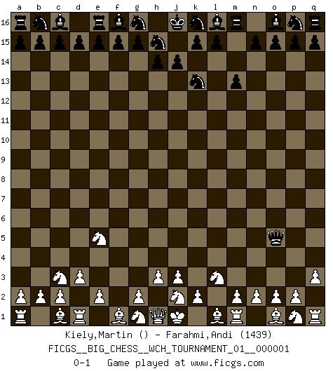 Last move : 0-1 2010 September 12 8:40:49 [Event "FICGS__BIG_CHESS__WCH_TOURNAMENT_01__000001"] [Site "FICGS"] [Date "2010.07.11"] [Round "1"] [White "Kiely,Martin"] [Black "Farahmi,Andi"] [Result "0-1"] [WhiteElo ""] [BlackElo "1439"] 1.q2-q3 j15-k13 2.b1-c3 h16-o10 3.d2-d3 o10-f2 4.e1-d1 m15-m13 5.h2-g4 f2-f7 6.g4-e5 f7-l2 7.k1-l3 l2-o5 0-1 This big chess game has been lost on time (started : 2010.07.11 0:50:7) Follow this game move after move (download)Avoid the crowd. Do your own thinking independently. Be the Chess player, not the Chess piece. (Ralph Charell) Der 70jährige Viktor Kortschnoi: Die Rentenanstalt wollte mich zwingen in Rente zu gehen. Meine Frau erhält jetzt eine Pension- und ich zahle weiter in die Rentenkasse ein! (Viktor Kortschnoi) En un gambito tu regalas un Peón por el bién de tomar un juego perdido. (Samuel Standige Boden) Les écrivains ont utilisé les échecs pour analyser les côtés extrêmes de la nature humaine. Dans ce cadre, les échecs offrent un champ d'expérimentation idéal. Mais on pourrait faire la même chose avec la peinture. Et là, en vous référant à Van Gogh, vous ne tirerez pas de conclusion définitive sur les peintres. (Gary Kasparov) Chess is as much a mystery as women. (Purdy)