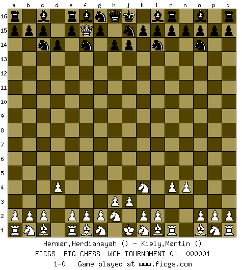 Last move : 1-0 2010 September 12 8:40:49 [Event "FICGS__BIG_CHESS__WCH_TOURNAMENT_01__000001"] [Site "FICGS"] [Date "2010.07.11"] [Round "1"] [White "Herman,Herdiansyah"] [Black "Kiely,Martin"] [Result "1-0"] [WhiteElo ""] [BlackElo ""] 1.j2-k4 k16-l14 2.h1-o7 p16-o14 3.o7-f15 h15-f14 4.d2-d4 d15-d14 5.m2-m4 b16-c14 6.n2-n4 1-0 This big chess game has been lost on time (started : 2010.07.11 0:50:7) Follow this game move after move (download)Fischer is under obligation to nobody. (Joseph Platz) Je älter ich werde, um so mehr schätze ich die Bauern. (Paul Keres) El poder defensivo de una pieza clavada, solamente es imaginario. (Aaron Nimzovich) Les ravages du H expliquent la différence de niveau entre Tal et Thal [Abergel]. When you have everything, sometimes it feels like nothing. (Horatio Caine, C.S.I. Miami)