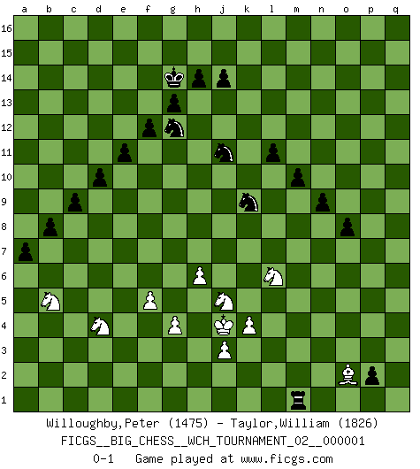 Last move : 0-1 2011 April 13 11:52:40 [Event "FICGS__BIG_CHESS__WCH_TOURNAMENT_02__000001"] [Site "FICGS"] [Date "2010.07.11"] [Round "1"] [White "Willoughby,Peter"] [Black "Taylor,William"] [Result "0-1"] [WhiteElo "1475"] [BlackElo "1826"] 1.j2-k4 g15-g14 2.g2-g4 h16-c11 3.b1-c3 m15-m13 4.h1-l4 k16-l14 5.n2-n3 e15-e13 6.l4-c12 c11-c12 7.o1-c12 f15-f14 8.d2-d3 c15-c14 9.c1-o12 n15-n13 10.o12-e3 d15-d13 11.c12-b11 c16-f13 12.h3-h4 p16-o14 13.q2-q4 o16-j11 14.p1-o3 l16-p12 15.m2-m4 f16-b12 16.f1-j4 b16-d15 17.f2-f3 d15-c13 18.b11-h5 f13-l8 19.h5-l8 p12-l8 20.l1-m2 f14-f13 21.k4-m5 l8-k7 22.m2-b12 j11-g9 23.n3-n4 a15-a13 24.b12-e9 h15-j13 25.g1-h3 b15-b13 26.q1-q3 j16-h15 27.m1-m3 j15-k13 28.m3-k3 k7-g10 29.k3-k5 g10-l6 30.k5-k13 l6-j4 31.k13-k15 j13-k15 32.h2-j4 l14-j13 33.k1-h2 g16-f14 34.j1-j2 c13-e12 35.e9-g7 j13-l12 36.q3-p3 q16-p16 37.p3-p9 g9-j11 38.e1-q1 j11-k10 39.g7-e9 k15-j13 40.e3-h6 b13-b12 41.q1-q3 o14-n12 42.q3-p3 p15-p14 43.a1-m1 o15-o13 44.p9-p10 e16-k16 45.p3-p7 l15-l13 46.p7-a7 c14-c13 47.m1-m3 k16-k11 48.m3-k3 m16-k16 49.p10-q10 p16-q16 50.m5-l7 k10-g13 51.p2-p4 a13-a12 52.l7-j8 a12-a11 53.j8-h10 k11-k10 54.q10-k10 k16-k10 55.h10-j12 g13-a7 56.j12-k10 l12-k10 57.k3-k10 a16-k16 58.k10-a10 a7-c9 59.a2-a4 c9-b10 60.h3-g5 k16-k7 61.c3-e4 q16-k16 62.a10-a8 k7-o7 63.o3-n5 o7-o2 64.a8-h8 b10-d12 65.n5-m3 o2-l2 66.h8-h7 f14-g12 67.m3-k4 l2-p2 68.p4-p5 p2-p4 69.h7-q7 k16-k15 70.m4-m5 p4-n4 71.c2-c4 g14-g13 72.b2-b4 h15-g14 73.b4-b5 n4-n1 74.a4-a5 n1-e1 75.e4-g3 e1-o1 76.h6-g7 m13-m12 77.h4-h5 o1-o9 78.a5-a6 q15-q13 79.j4-l3 k15-k9 80.e9-f8 o9-q9 81.q7-p7 p14-p13 82.p7-o7 q9-o9 83.o7-q7 q13-q12 84.g3-j4 j13-l12 85.g7-h6 o9-q9 86.p5-p6 q9-q7 87.p6-q7 k9-q9 88.e2-e3 d12-c11 89.f8-c11 e12-c11 90.e3-e4 q9-q7 91.h6-l9 q7-d7 92.c4-c5 d7-d3 93.l9-j7 c11-e12 94.b5-b6 o13-o12 95.j7-g9 d3-d9 96.g9-d6 d9-q9 97.a6-a7 q9-q4 98.f3-f4 q12-q11 99.k4-l6 q11-q10 100.j4-l5 q10-q9 101.l5-n6 q9-q8 102.l6-m4 q8-q7 103.l3-n2 q7-q6 104.m4-o5 q4-q2 105.n2-o4 q6-q5 106.o4-p6 p13-p12 107.n6-p7 p12-p11 108.d6-g9 o12-o11 109.g9-n3 o11-o10 110.n3-o4 q2-q1 111.o4-p3 p11-p10 112.o5-q4 o10-o9 113.p7-q5 n12-m10 114.g5-j4 q1-c1 115.p6-o8 p10-p9 116.o8-n6 c1-c5 117.p3-l7 n13-n12 118.l7-f2 c5-c2 119.f2-g3 c2-b2 120.q5-o6 n12-n11 121.f4-f5 b2-b6 122.e4-e5 n11-n10 123.o6-n4 m12-m11 124.q4-o5 l12-j11 125.j4-l5 l13-l12 126.n4-m6 b6-b2 127.e5-e6 e12-c11 128.k2-k4 c11-d9 129.j2-h3 b2-a2 130.g3-k6 d13-d12 131.k6-j7 m10-k9 132.j7-n11 p9-p8 133.h2-j4 a2-a7 134.l5-k7 c13-c12 135.k7-h6 a7-a2 136.j4-k6 a11-a10 137.h6-f7 b12-b11 138.f7-e5 c12-c11 139.k6-j8 b11-b10 140.j8-g7 a10-a9 141.m6-k5 a9-a8 142.e5-d7 d12-d11 143.g7-f9 e13-e12 144.e6-e7 a2-a7 145.d7-c5 d9-e7 146.f9-e7 a7-e7 147.k5-h6 c11-c10 148.h6-g8 e7-e2 149.g8-f6 b10-b9 150.f6-e4 f13-f12 151.o5-m6 e2-m2 152.m6-k5 m2-m5 153.k5-h4 e12-e11 154.n6-l5 d11-d10 155.c5-e6 b9-b8 156.e4-d6 c10-c9 157.d6-b5 a8-a7 158.e6-d4 l12-l11 159.h3-j4 m11-m10 160.h4-g6 n10-n9 161.l5-j6 o9-o8 162.j6-k8 p8-p7 163.h5-h6 p7-p6 164.g6-j5 p6-p5 165.n11-q8 p5-p4 166.k8-l6 p4-p3 167.q8-m4 p3-p2 168.m4-o2 m5-m1 0-1 Follow this game move after move (download)Pawns are born free, yet they are everywhere in chains. (Rick Kennedy) Spiel ein langweiliges Spiel zu Ende und lustige Dinge können passieren. (Hans Ree) El Ajedrez, como cualquier actividad creativa, solo puede existir a través del esfuerzo combinado de aquellos que tienen talento creativo y de aquellos que poseen la habilidad de organizar su trabajo creativo. (Mikhail Botvinnik) On entre au jeu d'Echecs comme on entre en Religion. Pour le joueur d'Echecs, la partie d'Echecs c'est l'office, la messe, le défilé du 1er Mai, le dépôt de gerbe au Monument aux Morts. C'est un drame sacré. (Michel Roos) Work expands to fill the time available. (C. Northcote Parkinson, in Parkinson's Laws)