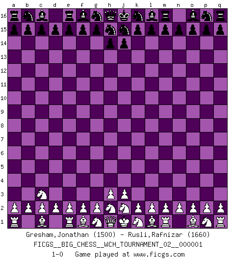 Last move : 1-0 2010 October 29 22:36:52 [Event "FICGS__BIG_CHESS__WCH_TOURNAMENT_02__000001"] [Site "FICGS"] [Date "2010.09.28"] [Round "1"] [White "Gresham,Jonathan"] [Black "Rusli,Rafnizar"] [Result "1-0"] [WhiteElo "1500"] [BlackElo "1660"] 1.b1-c3 1-0 This big chess game has been lost on time (started : 2010.09.28 11:47:43) Follow this game move after move (download)Chess makes man wiser and clear-sighted. (Vladimir Putin) Wenn ich mich einlogge, glauben die Leute gewöhnlich nicht, dass ich es selbst bin und sie fangen an, mir dumme Fragen zu stellen. Und wenn sie es glauben, stellen sie wieder andere dumme Fragen. (Judith Polgar) Fischer sacrificó virtualmente todo lo que la mayoría de nosotros los 'debiles' (término que él usa) valoramos, respetamos y apreciamos por el amor de un astuto, a menudo hermoso tablero de juego, por el privilegio ambivalente de ser su mas grande maestro. (Paul Kollar) Karpov est une pièce de musée. (Garry Kasparov) Logic : The art of thinking and reasoning in strict accordance with the limitations and incapacities of the human misunderstanding. (Ambrose Bierce)