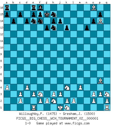 Last move : 1-0 2010 December 11 10:26:21 [Event "FICGS__BIG_CHESS__WCH_TOURNAMENT_02__000001"] [Site "FICGS"] [Date "2010.09.28"] [Round "1"] [White "Willoughby,Peter"] [Black "Gresham,Jonathan"] [Result "1-0"] [WhiteElo "1475"] [BlackElo "1500"] 1.j2-k4 p16-o14 2.h1-o7 j15-h13 3.d2-d4 b16-a14 4.c1-o12 m15-m14 5.e2-e3 o14-p12 6.f1-d3 h16-o10 7.o7-o10 p12-o10 8.m2-m4 n15-n13 9.o12-q10 d15-d14 10.l1-p5 o15-o14 11.p2-p3 m14-m13 12.o1-q3 o16-b4 13.b1-c3 b4-c3 14.b2-c3 c16-q3 15.p1-q3 m16-m14 16.m1-m3 m14-l14 17.d3-b5 k15-k13 18.m3-o3 o10-n12 19.b5-c4 l16-n14 20.a1-b1 b15-b14 21.b1-b5 k16-m15 22.g1-f3 g16-f14 23.b5-l5 a14-c13 24.l5-l14 m15-l13 25.l14-l15 n14-m15 26.c4-m13 j16-h16 27.m13-n12 q16-l16 28.l15-l16 m15-l16 29.n12-q15 l16-n14 30.a2-a4 g15-g13 31.q10-p9 n14-h9 32.p9-l13 h16-g15 33.q15-p14 h9-o3 34.n2-o3 c13-e14 35.l13-o16 1-0 This big chess game has been lost on time (started : 2010.09.28 11:47:43) Follow this game move after move (download)The chessboard is the world, the pieces are the phenomena of the Universe, the rules of the game are what we call the laws of Nature and the player on the other side is hidden from us. (Thomas Huxley) Der Umstand, daß uns eine 7 Stunden Zeitkontrolle ermöglicht eine großartige, tiefe Partie zu spielen, ist für die Massenmedien nicht weiter von Bedeutung. (Alexej Shirov) Los errores estan ahí, esperando a que se cometan. (Savielly Tartakower) Vous n'êtes pas toujours obligé de jouer le meilleur coup. Un coup doit être actif, entreprenant, correct et beau ! (David Bronstein) All war is based on deception. (Sun Tzu)