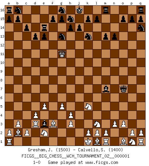 Last move : 1-0 2010 December 22 22:25:37 [Event "FICGS__BIG_CHESS__WCH_TOURNAMENT_02__000001"] [Site "FICGS"] [Date "2010.09.28"] [Round "1"] [White "Gresham,Jonathan"] [Black "Calvello,Simone"] [Result "1-0"] [WhiteElo "1500"] [BlackElo "1400"] 1.b1-c3 j15-k13 2.b2-b3 h16-o10 3.o2-o3 o10-f2 4.h2-f3 f2-l7 5.j2-h4 h15-g13 6.k1-l3 n15-n13 7.c1-b2 m15-m13 8.n2-n3 e15-e13 9.h4-k5 l7-l10 10.d2-d3 d15-d13 11.g1-j2 l16-p12 12.g2-g4 o16-d6 13.j1-k1 c16-m7 14.j2-h4 p12-q11 15.h1-m5 c15-c14 16.m5-m6 d6-g3 17.e1-d1 p16-q14 18.e2-e4 l10-o7 19.f1-g2 f16-a11 20.m6-g11 a11-h4 21.j3-h4 k16-h15 22.e4-e5 e16-e14 23.c3-e2 g3-f2 24.d3-d4 f2-e3 25.g4-g5 q11-p12 26.d1-d3 p12-f3 27.g2-f3 1-0 This big chess game has been lost on time (started : 2010.09.28 11:47:43) Follow this game move after move (download)For me, Chess is life and every game is like a new life. Every Chess player gets to live many lives in one lifetime. (Eduard Gufeld) Ich verstehe Aljechins Kombinationen ganz gut; aber woher er diese Angriffschancen bekommt und wie er die Eröffnung behandelt das ist für mich ein Buch mit sieben Siegeln. (Rudolf Spielmann) Cualquier cambio de material en una posición debe venir por medio de un mate, una captura o promoción de Peón. (Purdy) Demandez au pauvre Cg1 ce qu'il en pense. Eduard Gufeld à propos de la variante Saemisch de l'Est-Indienne. Life is like a game of cards: the hand you are dealt represents determinism; the way you play it is free will. (Jawaharlal Nehru)