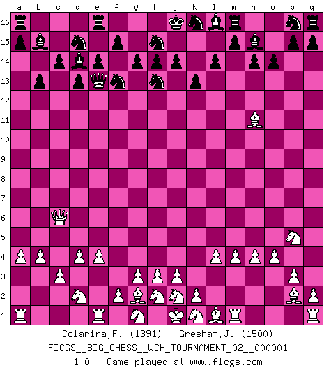 Last move : 1-0 2010 December 9 10:25:5 [Event "FICGS__BIG_CHESS__WCH_TOURNAMENT_02__000001"] [Site "FICGS"] [Date "2010.09.28"] [Round "1"] [White "Colarina,Floram"] [Black "Gresham,Jonathan"] [Result "1-0"] [WhiteElo "1391"] [BlackElo "1500"] 1.g2-g3 n15-n14 2.p2-p3 o16-n15 3.o1-p2 e15-e14 4.p1-q3 g15-g14 5.o2-o4 c15-c14 6.d2-d4 l15-l14 7.h1-c6 o15-o14 8.f1-g2 g16-e15 9.c2-c3 d15-d13 10.m2-m4 e15-f13 11.e2-e4 f16-d14 12.l2-l4 b16-d15 13.b2-b4 k15-k13 14.a2-a4 b15-b13 15.c1-n11 c16-b15 16.b1-d2 h16-e13 17.n2-n4 j15-h13 18.q3-p5 1-0 This big chess game has been lost on time (started : 2010.09.28 11:47:43) Follow this game move after move (download)Blessed be the memory of him who gave the world this immortal game. (A. G. Gardiner) Ich bin Weltmeister und muß mit niemandem irgend etwas diskutieren. (Viswanathan Anand) El Ajedrez es un terrible juego. Si no controlas el centro, tu oponente tiene una posición mas holgada. Si tienes control del centro, ¡entonces realmente tu tienes algo de que preocuparte!. (Siegbert Tarrasch) Il a essayé de se convaincre qu'il pourrait empêcher toutes les erreurs et ne jamais perdre. L'horreur ! Gary Kasparov au sujet de Robert Fischer. Wisdom is the reward you get for a lifetime of listening when you'd have preferred to talk. (Doug Larson)