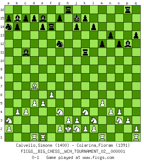 Last move : 0-1 2010 December 10 22:26:30 [Event "FICGS__BIG_CHESS__WCH_TOURNAMENT_02__000001"] [Site "FICGS"] [Date "2010.08.13"] [Round "1"] [White "Calvello,Simone"] [Black "Colarina,Floram"] [Result "0-1"] [WhiteElo "1400"] [BlackElo "1391"] 1.j2-k4 h15-g13 2.n2-n4 b15-b14 3.m2-m4 c16-b15 4.k1-l3 j15-k13 5.h2-g4 p15-p14 6.d2-d4 o16-p15 7.c2-c3 q15-q13 8.e2-e4 b16-a14 9.l1-p5 k16-h15 10.h1-o7 o15-o13 11.c1-l9 p16-q14 12.l9-g13 h15-g13 13.p5-g13 h14-g13 14.o7-f15 g16-h14 15.f15-g14 j16-j15 16.g14-g13 e15-e14 17.o1-f9 f16-e15 18.g13-g9 n15-n14 19.f1-b5 l15-l14 20.g9-p9 j15-h15 21.p9-p14 p15-g7 22.g1-j2 q14-p12 23.p14-p13 p12-o14 24.p2-p3 m16-p16 25.p13-j7 g7-c11 26.f9-k13 h14-k13 27.j7-h8 h15-j15 28.h8-o14 h16-h12 29.o14-j9 h12-j11 30.j9-j11 k13-j11 31.b1-a3 p16-p11 32.m4-m5 p11-o11 33.o2-o4 q16-p16 34.p1-o3 m15-m13 35.e4-e5 n14-n13 36.f2-f4 m13-m12 37.f4-f5 l16-n14 38.c3-c4 e16-f16 39.f5-f6 f16-f14 40.j1-h2 a16-h16 41.d4-d5 o13-o12 42.a1-d1 n14-p12 43.b5-d7 o11-k11 44.b2-b4 j11-g12 0-1 This big chess game has been lost on time (started : 2010.08.13 15:47:8) Follow this game move after move (download)A Chess game is divided into three stages: the first, when you hope you have the advantage, the second when you believe you have an advantage, and the third... when you know you're going to lose ! (Savielly Tartakower) Wenn du gegen Bobby spielst, ist es keine Frage von gewinnen oder verlieren. Es ist eine Frage des Überlebens. (Boris Vassilievich Spassky) Aún deseo matar a Fischer. (Boris Spassky) Pour se monter efficace, un Cavalier a besoin d'avant-postes ! Les Cavaliers font les meilleurs bloqueurs de pions passés. The human is the only animal species whose members are able to talk themselves into difficulties that would not otherwise exist. (Wendell Johnson)
