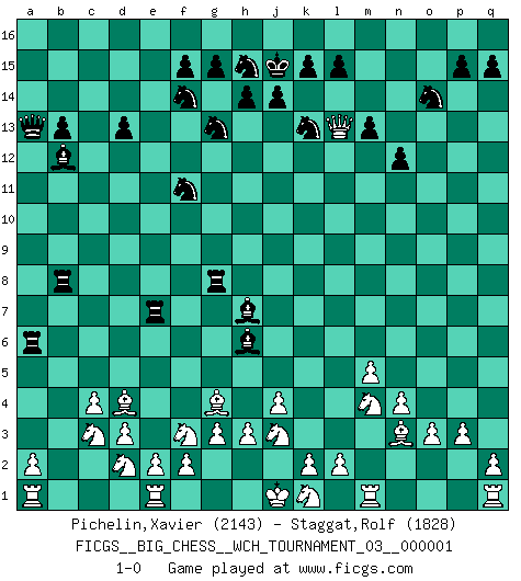 Last move : 1-0 2010 December 10 16:57:27 [Event "FICGS__BIG_CHESS__WCH_TOURNAMENT_03__000001"] [Site "FICGS"] [Date "2010.07.11"] [Round "1"] [White "Pichelin,Xavier"] [Black "Staggat,Rolf"] [Result "1-0"] [WhiteElo "2143"] [BlackElo "1828"] 1.j2-k4 j15-k13 2.h1-o7 h15-g13 3.o7-o15 p16-o14 4.o15-f7 d15-d13 5.d2-d3 h16-o10 6.o2-o3 c16-j10 7.f7-f10 m15-m13 8.g2-g3 l16-p12 9.c2-c3 e15-e13 10.f10-c10 k16-h15 11.c10-c15 e16-e15 12.c15-c10 b16-c14 13.n2-n4 p12-l8 14.f1-g2 a16-c16 15.g2-f3 o10-n10 16.o1-j6 l8-j6 17.f3-j6 n10-n6 18.m2-m4 n15-n13 19.p2-p3 c14-d12 20.c10-a10 g16-f14 21.a10-a15 b15-b13 22.a15-a5 o16-f8 23.m4-m5 n6-k6 24.h2-j4 k6-e11 25.b2-b3 e15-c15 26.k4-h5 f16-b12 27.c1-j7 e11-e6 28.j4-g5 e6-g6 29.g1-f3 j16-j15 30.j3-j4 j10-b3 31.a5-e5 g6-a12 32.e5-e13 d12-f11 33.e13-j9 n13-n12 34.l1-n3 c15-c9 35.j9-e5 m16-e16 36.e5-b8 b3-l12 37.j7-h8 e16-e8 38.b8-f4 q16-e16 39.g5-e4 c9-a9 40.b1-d2 e8-a8 41.h5-j3 e16-e6 42.j6-h5 a12-a13 43.c3-c4 f8-h6 44.f4-h4 h6-j5 45.h4-g4 c16-e16 46.e4-c3 a8-g8 47.g4-f5 l12-m11 48.f5-b5 e6-e9 49.h5-g4 e9-e8 50.h8-d4 e8-b8 51.b5-h5 a9-a5 52.h5-j6 j5-h6 53.p1-n2 e16-e7 54.n2-m4 m11-h7 55.j6-l6 a5-a6 56.l6-l13 1-0 Follow this game move after move (download)The essence of Chess is thinking about what Chess is. (David Bronstein) Schach ist ein Kampf gegen den Fehler. (Johannes Herrman Zukertort) El arma más poderosa en el Ajedrez, es tener la próxima movida. (David Bronstein) La vie et les Echecs sont tous les deux une lutte constante. (Lasker) A journey of a thousand sites begins with a single click. (Author unknown)