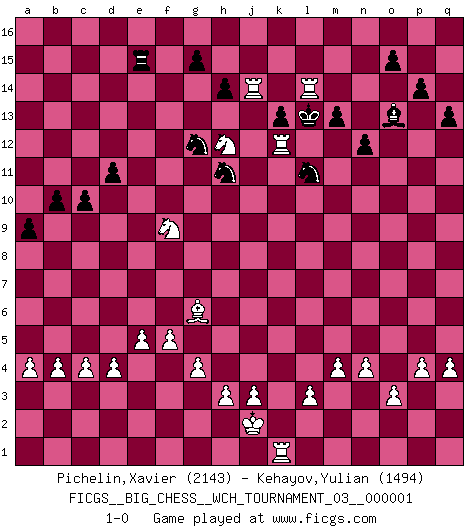 Last move : 1-0 2010 September 28 21:25:21 [Event "FICGS__BIG_CHESS__WCH_TOURNAMENT_03__000001"] [Site "FICGS"] [Date "2010.07.11"] [Round "1"] [White "Pichelin,Xavier"] [Black "Kehayov,Yulian"] [Result "1-0"] [WhiteElo "2143"] [BlackElo "1494"] 1.m2-m4 j15-k13 2.j2-g3 n15-n14 3.e2-e4 e15-e13 4.n2-n4 h16-o10 5.h1-k3 n14-n13 6.d2-d4 m15-m13 7.c2-c3 d15-d13 8.o2-o3 e16-e14 9.f1-e2 o10-l10 10.e2-k7 c15-c14 11.o1-j6 m16-m14 12.b2-b3 m14-l14 13.l1-m2 l10-l2 14.k3-l2 l14-l2 15.k1-l3 e14-f14 16.f2-f3 b15-b14 17.p1-n2 f16-b12 18.g3-j2 o16-f8 19.q1-p1 p16-o14 20.m2-p5 f14-d14 21.j6-m3 l2-l3 22.j2-l3 f8-l3 23.n2-l3 b12-l3 24.k2-l3 q16-m16 25.c1-k8 m16-m14 26.k8-e13 d14-e14 27.e13-h10 b16-a14 28.h10-m14 k13-m14 29.k7-l8 e14-g14 30.l8-c16 a16-c16 31.m3-a14 c16-e16 32.g2-g4 e16-e14 33.a14-k5 e14-e13 34.m1-k1 l16-o13 35.b1-d2 p15-p14 36.k5-j4 g14-g13 37.p5-g13 h15-g13 38.k1-k6 k16-h15 39.p1-k1 h15-j13 40.g1-j2 j16-j15 41.j2-h4 g16-f14 42.j1-j2 c14-c13 43.k1-k4 d13-d12 44.e1-k1 k15-k13 45.h2-k3 g13-h11 46.k3-l5 f14-g12 47.d2-c4 o14-n12 48.c4-e5 n12-l11 49.e5-g6 a15-a13 50.e4-e5 g12-f10 51.f3-f4 b14-b13 52.f4-f5 c13-c12 53.j4-n8 b13-b12 54.n8-f15 c12-c11 55.k4-j4 n13-n12 56.k6-j6 j15-k14 57.k1-k2 d12-d11 58.a1-k1 l15-l14 59.p2-p4 q15-q14 60.q2-q4 q14-q13 61.a2-a4 a13-a12 62.g6-h8 e13-e15 63.f15-l10 b12-b11 64.h4-g6 m14-l12 65.g6-j7 l12-j11 66.l10-g6 j11-h9 67.j7-h9 f10-h9 68.h8-f9 h9-f10 69.l5-k7 c11-c10 70.k7-h8 a12-a11 71.b3-b4 b11-b10 72.c3-c4 a11-a10 73.h8-g10 j13-g12 74.j6-j14 k14-l13 75.j14-j15 a10-a9 76.g10-h12 l13-k14 77.j4-j14 k14-l13 78.j15-l15 h11-k12 79.k2-k12 f10-h11 80.l15-l14 1-0 Follow this game move after move (download)There is only one thing Fischer does in Chess without pleasure: to lose ! (Boris Spassky) Im Internet Chess Club betrug mein Rating vorübergehend 3350 ELO-Punkte. (Sergej Karjakin) Alguna parte de un error es siempre correcto. (Savielly Tartakover) Lorsque vous vous retrouvez devant une position atroce, ne tendez pas un ultime piège dérisoire avec l'intention d'abandonner si l'adversaire le déjoue ! Faites-vous plutôt un devoir de résister comme si votre vie en dépendait. Jouez le coup qui vous déplairait au centuple si vous étiez dans la peau de votre tortionnaire ! There are two kinds of people in the world, my friend. Those who have a loaded gun and those who dig. You dig ! (Blondie in The Good, The Bad and The Ugly)