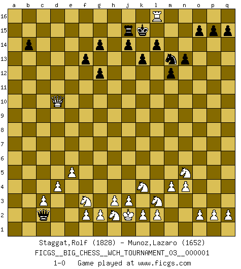 Last move : 1-0 2010 November 15 4:17:21 [Event "FICGS__BIG_CHESS__WCH_TOURNAMENT_03__000001"] [Site "FICGS"] [Date "2010.07.11"] [Round "1"] [White "Staggat,Rolf"] [Black "Munoz,Lazaro"] [Result "1-0"] [WhiteElo "1828"] [BlackElo "1652"] 1.j2-k4 h15-g13 2.p1-o3 p16-o14 3.n2-n4 g15-g14 4.g1-f3 j15-k13 5.m2-m4 b16-c14 6.d2-d4 h16-a9 7.e2-e4 g16-f14 8.l1-p5 k16-h15 9.b1-c3 n15-n13 10.f1-b5 f14-h13 11.o1-f9 h13-j15 12.c1-l9 m15-m13 13.k1-l3 a9-b8 14.h1-l4 l16-n14 15.e4-e5 o16-b4 16.e1-e4 b4-c3 17.b2-c3 l15-l14 18.j1-j2 b8-j8 19.b5-d3 j8-c8 20.l9-d2 e15-e13 21.e4-g4 d15-d13 22.a1-b1 f16-d14 23.b1-b4 b15-b14 24.f9-b13 m13-m12 25.m1-b1 n14-a2 26.b4-b8 c8-c13 27.b1-b5 c13-c9 28.d2-g5 c9-c10 29.b5-c5 c10-d10 30.b8-b10 d10-j5 31.b13-c14 c16-p4 32.c14-e16 a16-e16 33.q1-a1 a2-e6 34.g5-h4 j5-j13 35.g4-g6 e6-j10 36.a1-a15 j15-h13 37.b10-a10 j16-j15 38.l4-l13 h15-k14 39.o3-n5 p4-k9 40.g6-j6 m16-m13 41.l13-f8 f15-f13 42.d3-k9 h13-k12 43.k9-j10 k12-j10 44.j6-j10 j13-p7 45.j10-p10 p7-h7 46.p5-g13 h14-g13 47.c5-c15 d14-c15 48.a15-c15 j15-k16 49.p10-h10 h7-c2 50.a10-a15 m13-m15 51.f8-g7 g13-g12 52.g7-c7 o14-m13 53.c7-c14 e16-g16 54.c14-e14 g16-j16 55.e14-e13 k14-h13 56.e13-d13 k13-j15 57.h4-c9 k15-k13 58.c9-j15 h13-j15 59.d13-d10 q16-l16 60.c15-j15 m15-j15 61.a15-j15 j16-j15 62.h10-h16 k16-k15 63.h16-l16 1-0 Follow this game move after move (download)Spassky will not be psyched out by Fischer. (Mike Goodall) Wenn ich Weiß habe gewinne ich weil ich Weiß habe, wenn ich Schwarz habe gewinne ich weil ich Bogoljubov bin. (Efim Bogoljubov) El Ajedrez es de 30 a 40 por ciento psicología. Uno no cuenta con esto cuando se juega contra una computadora. No lo puedo confundir. (Judith Polgar) Nous sommes les pions de la mystérieuse partie d'Echecs jouée par Dieu. Il nous déplace, nous arrête, nous pousse encore, puis nous lance un à un dans la boîte du Néant. Epitaphe sur la tombe de David Janowsky (1868-1927). If computers get too powerful, we can organize them into committees. That'll do them in. (Anonymous)