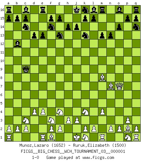 Last move : 1-0 2010 October 8 9:27:12 [Event "FICGS__BIG_CHESS__WCH_TOURNAMENT_03__000001"] [Site "FICGS"] [Date "2010.08.13"] [Round "1"] [White "Munoz,Lazaro"] [Black "Ruruk,Elizabeth"] [Result "1-0"] [WhiteElo "1652"] [BlackElo "1500"] 1.j2-k4 h15-g13 2.h2-g4 j15-k13 3.p2-p3 m15-m13 4.o1-p2 e15-e13 5.b1-c3 b16-c14 6.d2-d4 n15-n13 7.h1-o7 d15-d13 8.g1-f3 g16-f14 9.c1-p13 o15-o14 10.p13-l9 f16-b12 11.m2-m4 p16-q14 12.l1-p5 h16-p9 13.p5-n7 p9-n9 14.l9-m8 n9-c9 15.e2-e4 1-0 This big chess game has been lost on time (started : 2010.08.13 15:49:2) Follow this game move after move (download)I look one move ahead... the best ! (Siegbert Tarrasch) Ich rechne überhaupt nicht voraus. Ich gewinne auch so. (Robert James Fischer) Las ideas audaces son como las piezas del Ajedrez que avanzan hacia adelante. Ellas pueden ser vencidas, pero también pueden iniciar una partida victoriosa. (Goethe) Roi des jeux et jeu des rois, les échecs portent en eux un sentiment d'infini. Ils donnent à celui qui s'est efforcé d'en approfondir les arcanes l'impression de n'être pas à la mesure de l'homme; en fait, ils constituent un résumé de l'univers, un microcosme, et figurent cette grande échelle qui, dans les plans de la lumière descend jusqu'à la matière, qui des abîmes insondables remonte jusqu'en l'infini de Dieu. (Pyrame) However beautiful the strategy, you should occasionally look at the results. (Winston Churchill)