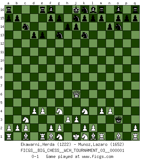 Last move : 0-1 2010 October 6 9:19:7 [Event "FICGS__BIG_CHESS__WCH_TOURNAMENT_03__000001"] [Site "FICGS"] [Date "2010.08.13"] [Round "1"] [White "Ekawarni,Herda"] [Black "Munoz,Lazaro"] [Result "0-1"] [WhiteElo "1222"] [BlackElo "1652"] 1.j2-k4 h15-g13 2.h1-o7 p16-o14 3.o7-c7 j15-k13 4.c7-c15 b16-c14 5.c15-j9 h16-o10 6.h2-g4 o10-o2 7.m2-m4 o2-o13 8.b1-c3 n15-n14 9.n2-n4 d15-d13 10.j9-j6 g16-j15 11.e2-e4 e15-e13 12.d2-d4 c16-p4 13.p1-o3 p4-o3 14.p2-o3 o13-o3 0-1 This big chess game has been lost on time (started : 2010.08.13 15:50:56) Follow this game move after move (download)What would Chess be without silly mistakes ? (Kurt Richter) Die jungen Leute sollen verstehen, dass sie noch etwas von mir lernen können und müssen. (Viktor Kortschnoi) Aún deseo matar a Fischer. (Boris Spassky) Le joueur d'Echecs qui veut atteindre le top est obligé de développer son propre credo créatif. Alexeï Stepanovicth Souétine. Il est facile d'écrire des livres ! Ce qui est difficile, c'est de jouer ! (Alexeï Stepanovicth Souétine) If you know the enemy and know yourself you need not fear the results of a hundred battles. (Sun Tzu)