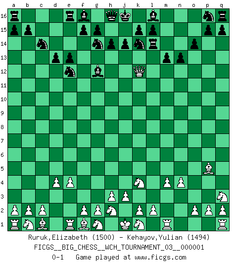 Last move : 0-1 2010 October 10 21:40:38 [Event "FICGS__BIG_CHESS__WCH_TOURNAMENT_03__000001"] [Site "FICGS"] [Date "2010.08.13"] [Round "1"] [White "Ruruk,Elizabeth"] [Black "Kehayov,Yulian"] [Result "0-1"] [WhiteElo "1500"] [BlackElo "1494"] 1.j2-k4 o15-o14 2.h1-o7 j15-g14 3.o7-c7 h15-k14 4.c7-c15 b16-c14 5.c15-l7 k16-l14 6.e2-e4 m15-m13 7.m2-m4 d15-d13 8.n2-n4 n15-n13 9.d2-d4 o16-k12 10.p1-q3 e15-e13 11.l7-k8 c16-g12 12.o1-f9 m16-m14 13.f9-l14 m14-l14 14.k8-k12 g16-f14 15.l1-p5 f14-e12 0-1 This big chess game has been lost on time (started : 2010.08.13 15:49:2) Follow this game move after move (download)Not only will I predict his triumph over Botvinnik, but I'll go further and say that he'll probably be the greatest Chess player that ever lived. (John Collins) Jeder leidlich begabte Spieler, er braucht keineswegs hervorragend veranlagt zu sein, kann es zum Meister bringen. Aber das ist ja auch gar nicht nötig! Der richtige Standpunkt ist es, zu seinem Vergnügen zu spielen, und man glaube ja nicht, dass der Genuss proportional dem Können sei. (Siegbert Tarrasch) Si yo gano un torneo, yo lo gano por mí mismo. Yo hago las jugadas. Nadie me ayuda. (Bobby Fischer) Il s'avisa de me proposer d'apprendre les échecs qu'il jouait un peu... me voilà forcené des échecs. J'achète un échiquier, je m'enferme dans ma chambre, j'y passe des jours et des nuits à vouloir apprendre par cur toutes les parties. (Jean-Jacques Rousseau, Confessions) I would love to change the world, but they won't give me the source code. (Unknown)