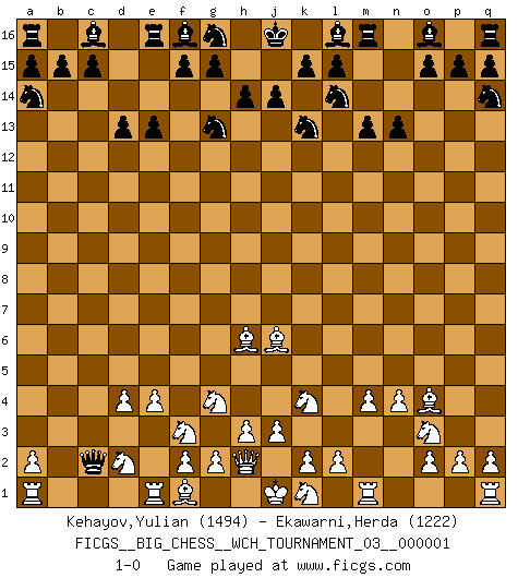 Last move : 1-0 2010 October 9 9:31:15 [Event "FICGS__BIG_CHESS__WCH_TOURNAMENT_03__000001"] [Site "FICGS"] [Date "2010.08.13"] [Round "1"] [White "Kehayov,Yulian"] [Black "Ekawarni,Herda"] [Result "1-0"] [WhiteElo "1494"] [BlackElo "1222"] 1.h2-g4 j15-k13 2.j2-k4 m15-m13 3.m2-m4 e15-e13 4.e2-e4 h15-g13 5.n2-n3 d15-d13 6.d2-d4 n15-n13 7.n3-n4 b16-a14 8.c1-h6 p16-q14 9.o1-j6 k16-l14 10.l1-o4 h16-q8 11.p1-o3 q8-b8 12.h1-h2 b8-b2 13.b1-d2 b2-c2 14.g1-f3 1-0 This big chess game has been lost on time (started : 2010.08.13 15:50:56) Follow this game move after move (download)Help your pieces so they can help you. (Paul Morphy) Je mehr ich von der FIDE weiss, um so weniger verstehe ich. (Alexander Kalifman) Alguna parte de un error es siempre correcto. (Savielly Tartakover) Des points faibles ou des trous dans la position de l'adversaire doivent être occupés par des pièces et non pas par des pions. (Siegbert Tarrasch) As a goal marker shodan is important. As a destination it is a poor place to stop. (Thomas Tamayo)