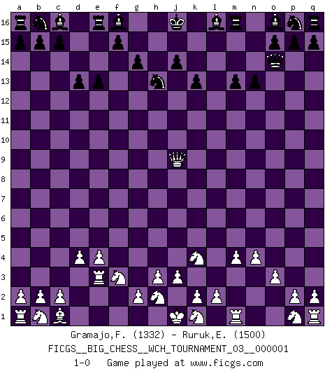 Last move : 1-0 2010 October 9 9:31:15 [Event "FICGS__BIG_CHESS__WCH_TOURNAMENT_03__000001"] [Site "FICGS"] [Date "2010.08.13"] [Round "1"] [White "Gramajo,Francisco"] [Black "Ruruk,Elizabeth"] [Result "1-0"] [WhiteElo "1332"] [BlackElo "1500"] 1.n2-n4 j15-k13 2.o1-f9 h16-l13 3.j2-k4 l13-f8 4.h1-l4 f8-f2 5.g1-f3 f2-o10 6.o2-o3 m15-m13 7.e2-e4 e15-e13 8.f9-k13 j14-k13 9.d2-d4 n15-n13 10.f1-a6 k16-j14 11.a6-j14 k15-j14 12.l4-l15 o10-o14 13.m2-m4 h15-j13 14.l1-q6 g16-j15 15.q6-j13 h14-j13 16.l15-j13 d15-d13 17.e1-e3 g15-g14 18.j13-g11 j15-h13 19.g11-j9 1-0 This big chess game has been lost on time (started : 2010.08.13 15:49:2) Follow this game move after move (download)I prefer to lose a really good game than to win a bad one. (David Levy) Schach ist ein schwarz-weisser Dschungel. (Garry Kasparov) Del Ajedrez se ha dicho que la vida no es lo suficientemente larga para él, pero eso es culpa de la vida, no del Ajedrez. (William Ewart Napier) Il a essayé de se convaincre qu'il pourrait empêcher toutes les erreurs et ne jamais perdre. L'horreur ! Gary Kasparov au sujet de Robert Fischer. You think that education is too expensive ? Try ignorance. (Derek Bok)