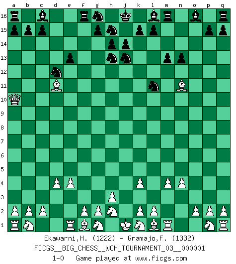Last move : 1-0 2010 September 30 23:41:1 [Event "FICGS__BIG_CHESS__WCH_TOURNAMENT_03__000001"] [Site "FICGS"] [Date "2010.08.13"] [Round "1"] [White "Ekawarni,Herda"] [Black "Gramajo,Francisco"] [Result "1-0"] [WhiteElo "1222"] [BlackElo "1332"] 1.j2-k4 d15-d13 2.h1-o7 j15-h13 3.o7-o15 p16-o14 4.o15-k11 h15-j13 5.k11-d11 k16-h15 6.d11-d13 e15-e14 7.d13-l6 o14-m13 8.n2-n4 f16-b12 9.e2-e4 b12-k4 10.j3-k4 b16-c14 11.m2-m4 n15-n13 12.l6-l7 e14-e13 13.l7-f7 m13-l11 14.f7-f15 e16-f16 15.f15-a10 m15-m13 16.d2-d4 c14-d12 17.o1-d11 h16-n11 18.c1-n11 1-0 Follow this game move after move (download)War is the child of passion, passion is the child of narcissism and narcissism is the child. (...) Another game ? (Thibault de Vassal) Er war ein guter Schachspieler, aber ich kann Leute nicht ausstehen, die 'Heil Hitler' rufen (Über Alexander Aljechin). (Miguel Najdorf) No hay un Gran Maestro de Ajedrez que sea normal; solo se diferencían ellos por la magnitud de su locura. (Viktor Korchnoi) La guerre est enfant de la passion, la passion est enfant du narcissisme et le narcissisme est l'enfant. (...) Une autre partie ? (Thibault de Vassal) A good player is always lucky. (Capablanca)