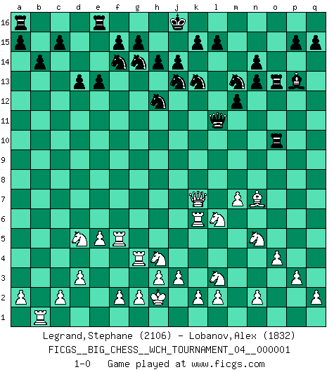 Last move : 1-0 2010 November 21 18:49:42 [Event "FICGS__BIG_CHESS__WCH_TOURNAMENT_04__000001"] [Site "FICGS"] [Date "2010.07.11"] [Round "1"] [White "Legrand,Stephane"] [Black "Lobanov,Alex"] [Result "1-0"] [WhiteElo "2106"] [BlackElo "1832"] 1.m2-m4 j15-k13 2.p1-o3 p16-o14 3.e2-e4 h16-o10 4.h2-g4 b16-c14 5.b1-c3 n15-n13 6.f1-c4 m15-m13 7.d2-d3 d15-d13 8.p2-p3 g16-f14 9.l1-o4 e15-e13 10.j2-k4 o16-l13 11.o1-p2 h15-j13 12.k1-l3 l16-n14 13.c1-k8 c16-l8 14.o4-l7 o10-n10 15.g4-h6 f16-b12 16.o3-n5 m13-m12 17.c4-n14 o15-n14 18.o2-o4 o14-m13 19.m4-m5 k16-l14 20.m5-m6 q16-o16 21.m6-m7 l8-j10 22.p2-k7 n10-l12 23.g1-f3 b12-h6 24.k8-h10 l13-h10 25.l7-h10 o16-o10 26.h10-m6 m16-o16 27.h1-k3 o10-k10 28.k7-j8 h6-f4 29.j1-j2 j10-h9 30.k3-m5 h9-j8 31.m5-j8 o16-o13 32.m6-n7 k10-n10 33.k4-l6 l12-l10 34.j8-j6 l10-g10 35.f3-h4 c14-d12 36.m1-m5 d12-f11 37.m5-f5 f4-d2 38.e1-e2 d2-p13 39.n7-l5 n10-j10 40.j6-f6 f11-h12 41.e4-e5 g10-b10 42.f6-f7 b10-b2 43.c3-d5 b2-b8 44.a1-b1 b8-p8 45.j2-h2 p8-n10 46.e2-e4 b15-b14 47.b1-b6 n10-k10 48.b6-k6 k10-j9 49.k6-j6 j9-k10 50.j6-k6 k10-l11 51.l5-n7 j10-o10 52.e4-g4 j13-g14 53.q1-b1 l14-j13 54.f7-k7 1-0 Follow this game move after move (download)It is difficult to play against Einstein's theory --on his first loss to Fischer. (Mikhail Tal) Ich glaube, ich kenne inzwischen die Gründe für mein Versagen: schachliche Charakterfehler. Ich war nie ein Wunderkind und in meiner gesamten menschlichen Entwicklung immer zu langsam. (Viktor Kortschnoi) En el tablero, la mentira e hipocresía no sobreviven mucho. (Emanuel Lasker) Les Echecs représentent une sphère d'idées créatrices basée sur la volonté des deux protagonistes. (Smyslov) There are more things in heaven and earth than practically anywhere else. (Unknown)