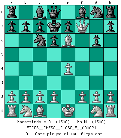 Last move : 1-0 2006 November 16 19:20:13 [Event "FICGS__CHESS__CLASS_E__000021"] [Site "FICGS"] [Date "2006.11.14"] [Round "1"] [White "Macarsindale,Arthur Alfred"] [Black "Mo,Manyu"] [Result "1-0"] [WhiteElo "1500"] [BlackElo "1500"] 1.e4 Nc6 2.Bc4 g6 3.Qf3 d6 4.Qxf7+ Kd7 5.Be6+ 1-0 KP : Nimzovich defense Player White won this chess game. Follow this game move after move (download)If you aren't afraid of Spassky, then I have removed the element of money. (Jim Slater) Schach verlangt totale Konzentration. (Robert James Fischer) Un sacrificio se refuta mucho mejor al aceptarlo. (Wilhelm Steinitz) Je menace de comprendre la position. (Anonyme) Faith : not wanting to know what is true. (Friedrich Nietzsche)