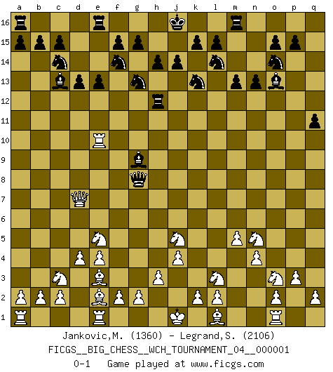 Last move : 0-1 2010 October 1 20:34:39 [Event "FICGS__BIG_CHESS__WCH_TOURNAMENT_04__000001"] [Site "FICGS"] [Date "2010.08.13"] [Round "1"] [White "Jankovic,Mladen"] [Black "Legrand,Stephane"] [Result "0-1"] [WhiteElo "1360"] [BlackElo "2106"] 1.j2-k4 j15-k13 2.h1-o7 h15-g13 3.n2-n4 p16-o14 4.m2-m4 e15-e13 5.k1-l3 b16-c14 6.e2-e4 d15-d13 7.d2-d4 n15-n14 8.b1-c3 m15-m13 9.g1-f3 f16-b12 10.m4-m5 c16-g12 11.p1-o3 h16-p9 12.m1-m4 o16-g9 13.m4-l4 b12-c13 14.l3-m1 p9-p11 15.c1-e3 g12-e10 16.l4-l10 e10-o1 17.q1-o1 k16-l14 18.p2-p3 q15-q13 19.o7-d7 g16-f14 20.h2-g4 n14-n13 21.f3-e5 l16-o13 22.l10-e10 q13-q12 23.f1-e2 q12-q11 24.j3-j4 q16-q12 25.k4-l6 q12-h12 26.g4-j5 p11-n9 27.m1-l3 n9-o8 28.l6-n5 o8-g8 0-1 Follow this game move after move (download)Tactics flow from a superior position. (Bobby Fischer) Schach ist gnadenlos. Du mußt bereit sein zu töten. (Nigel Short) Después de la respuesta de las negras a 1.e4 con 1..e5, se quedan siempre tratando de entrar dentro del juego. (Howard Staunton) Botvinnik disait en comparant les échecs à la musique: Il existe une science dont le but est l'étude de l'acoustique et des sons. Mais il y a aussi un art qui se sert de l'océan des sons : c'est la musique. De toute évidence, il en est de même pour la pensée. La logique est l'étude des lois de la réflexion et les échecs reflètent, en tant qu'art, le côté logique de la réflexion, sous la forme d'images artistiques... Extrait de Fischer - Spassky, Reykjavik 1972 par Alexander & F. Wyndham (Ed. Solar), p 37. Macintosh - we might not get everything right, but at least we knew the century was going to end. (Douglas Adams)
