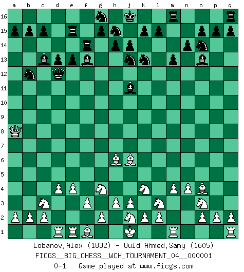 Last move : 0-1 2010 November 21 18:49:33 [Event "FICGS__BIG_CHESS__WCH_TOURNAMENT_04__000001"] [Site "FICGS"] [Date "2010.07.11"] [Round "1"] [White "Lobanov,Alex"] [Black "Ould Ahmed,Samy"] [Result "0-1"] [WhiteElo "1832"] [BlackElo "1605"] 1.j2-k4 j15-k13 2.p1-o3 p16-o14 3.b1-c3 h16-o10 4.h2-g4 b16-c14 5.m2-m4 e15-e13 6.n2-n4 f16-c13 7.h1-m5 m15-m13 8.d2-d4 l16-o13 9.m5-d13 o10-f10 10.e2-e4 c14-b12 11.d13-m5 d15-d13 12.c1-h6 f10-d12 13.m5-o7 c16-k9 14.o7-f15 e16-e15 15.f15-f6 a16-f16 16.f6-e5 f16-f12 17.o1-j6 f12-e12 18.e5-f6 e12-f12 19.f6-c6 n15-n14 20.l1-o4 f12-f14 21.g1-j2 h15-j13 22.f2-f3 k9-h11 23.c6-a8 k16-h15 24.k1-l3 o16-j11 25.a1-d1 h11-f13 0-1 Follow this game move after move (download)By the beauty of his games, the clarity of his play, and the brilliance of his ideas, Fischer made himself an artist of the same stature as Brahms, Rembrandt, and Shakespeare. (David Levy) Das Blackmar-Diemer-Gambit verändert den ganzen Menschen! (Emil Joseph Diemer) Yo siempre he tenido un ligero sentimiento de lástima por una persona que no tiene conocimiento del Ajedrez. (Siegbert Tarrasch) À la honte des hommes, on sait que les lois du jeu sont les seules qui soient partout justes, claires, inviolables et exécutées. Pourquoi l'Indien qui a donné les règles du jeu d'échecs est-il obéi de bon gré dans toute la terre, et que les décrétales des papes, par exemple, sont aujourd'hui un objet d'horreur et de mépris ? C'est que l'inventeur des échecs combina tout avec justesse pour la satisfaction des joueurs, et que les papes, dans leurs décrétales, n'eurent en vue que leur seul avantage. L'Indien voulut exercer également l'esprit des hommes et leur donner du plaisir; les papes ont voulu abrutir l'esprit des hommes. Voltaire (Dictionnaire philosophique / Garnier 1967) My poor ole parrot... Is not in the circulation of displays ....poo hoo hoo :) (Wayne Lowrance's enigma)