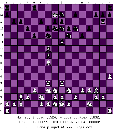 Last move : 1-0 2010 November 21 18:49:28 [Event "FICGS__BIG_CHESS__WCH_TOURNAMENT_04__000001"] [Site "FICGS"] [Date "2010.07.11"] [Round "1"] [White "Murray,Findlay"] [Black "Lobanov,Alex"] [Result "1-0"] [WhiteElo "1524"] [BlackElo "1832"] 1.j2-k4 j15-h13 2.o2-o3 p16-o14 3.d2-d3 n15-n13 4.c1-d2 h16-l13 5.d2-c3 b16-c14 6.e2-e4 k16-l14 7.n2-n4 d15-d13 8.f1-e2 m15-m13 9.o1-g8 h15-j13 10.e2-h5 c16-l8 11.h1-m5 l8-h5 12.m5-h5 l13-g9 13.h5-g4 c14-e13 14.g8-j6 o14-m15 15.g4-g9 o16-g9 16.h2-g4 m15-l13 17.m2-m4 l16-o13 18.l1-o4 f15-f14 19.k1-h2 c15-c14 20.p1-n2 g15-g13 21.q2-q4 g16-j15 22.q4-q5 e15-e14 23.q5-q6 f16-c13 24.b1-d2 k15-k13 25.q1-q5 o13-j8 26.l2-l3 j16-h15 27.q5-b5 b15-b14 28.m1-q1 g9-j11 29.q1-q5 m16-m14 30.g1-j2 m14-p14 31.p2-p3 c13-j7 32.j2-h4 m13-m12 33.j1-j2 e13-g12 34.e1-q1 l14-k12 35.d2-f3 e14-e13 36.j6-d11 e13-e12 37.d11-g8 j7-g9 38.q5-j5 j8-g10 39.b5-g5 1-0 Follow this game move after move (download)During a Chess competition a Chessmaster should be a combination of a beast of prey and a monk. (Alexander Alekhine) Garry Kasparov war erst in der Großmeister-Organisation GMA, dann in der Profischach-Vereinigung PCA, zum Schluss kehrte er wieder in den Schoß der FIDE zurück. Aber gut, manche Leute sind flexibel (Viswanathan Anand) Ciertamente, de todas la drogas del mundo, el Ajedrez debe ser el mas placentero permamentemente. (Assiac) Ce n'est pas pour s'amuser qu'il joue aux échecs : il célèbre un culte. (Vladimir Nabokov) I couldn't make any sense out of what this particular thread is about. It sounds like R2 D2 computer speaking. A space fight ?!? Some 'command' problems in Moscow ? Some killers & narcotic addicts attacking some game & a god wannabe ?? (Dinesh De Silva, lost in a russian conflict in FICGS forum)