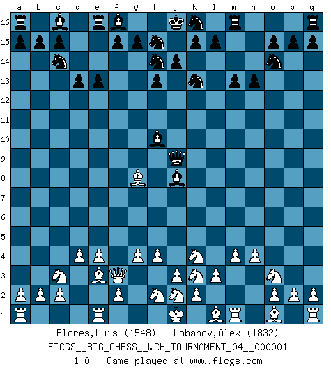Last move : 1-0 2010 November 21 18:49:16 [Event "FICGS__BIG_CHESS__WCH_TOURNAMENT_04__000001"] [Site "FICGS"] [Date "2010.09.28"] [Round "1"] [White "Flores,Luis"] [Black "Lobanov,Alex"] [Result "1-0"] [WhiteElo "1548"] [BlackElo "1832"] 1.g2-g4 j15-k13 2.b1-c3 b16-c14 3.m2-m4 h16-o10 4.h3-h4 o10-o5 5.l2-l3 m15-m13 6.p1-o3 h14-h13 7.j2-k4 d15-d13 8.d2-d4 e15-e13 9.e2-e4 g16-h14 10.k1-m2 n15-n13 11.n2-n4 o5-j10 12.h1-f3 o16-h10 13.g1-j2 p16-o14 14.f1-k5 l16-o13 15.m2-k3 o13-j8 16.k5-g8 j10-j9 17.c1-e3 1-0 Follow this game move after move (download)Look at Garry Kasparov. After he loses, invariably he wins the next game. He just kills the next guy. That's something that we have to learn to be able to do. (Maurice Ashley) Du weisst es gibt ein Problem mit Computern und Fernschach, wenn jeder eine Rating von 2450 hat. (John Christen Knudsen) Siempre es mucho mejor sacrificar las piezas de tu oponente. (Savielly Tartakover) C'est une question de caractère, Beaucoup de gens perdent leur motivation très vite. D'autres, ils sont rares, peuvent la conserver très longtemps. J'aime les échecs, encore aujourd'hui je suis heureux d'analyser des parties. J'aime toujours gagner, je déteste encore perdre. Bien jouer est important pour mon intégrité intellectuelle et morale. Et puis les échecs vivent en ce moment une période historique grâce à Internet. Ils se développent dans les systèmes éducatifs à travers le monde. Ils sortent de leur ghetto, et c'est mon rôle de mener à bien cette révolution. (Gary Kasparov) Once you start thinking you have nothing left to learn, you have everything to learn. (Steve Badget)