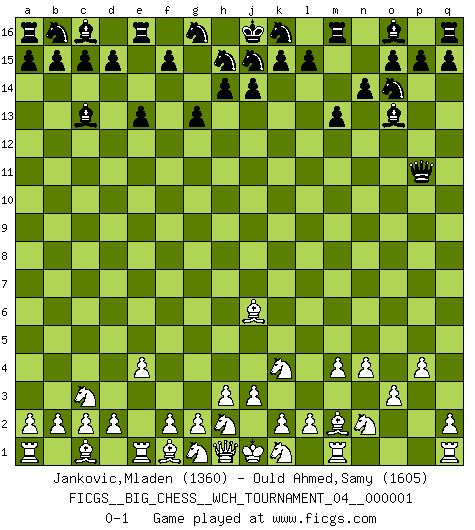 Last move : 0-1 2010 November 17 10:15:0 [Event "FICGS__BIG_CHESS__WCH_TOURNAMENT_04__000001"] [Site "FICGS"] [Date "2010.08.13"] [Round "1"] [White "Jankovic,Mladen"] [Black "Ould Ahmed,Samy"] [Result "0-1"] [WhiteElo "1360"] [BlackElo "1605"] 1.j2-k4 p16-o14 2.n2-n4 g15-g13 3.b1-c3 m15-m13 4.m2-m4 h16-c11 5.l1-m2 l16-o13 6.e2-e4 c11-o11 7.o2-o3 e15-e13 8.o1-j6 o11-p11 9.p2-p4 f16-c13 10.p1-n2 n15-n14 0-1 This big chess game has been lost on time (started : 2010.08.13 15:52:6) Follow this game move after move (download)Let the perfectionist play postal. (Yasser Seirawan) Capablanka war das größte Genie der Schachgeschichte! Aber denken sie nicht er habe nichts vom Schach verstanden. Er wusste nur soviel wie er wissen musste um seine Ziele zu erreichen. (Mikhail Moiseyevich Botvinik) La vida es como un juego de Ajedrez, cambiando con cada movimiento. (Proverbio Chino) Aidez vos pièces, elles vous aideront. (Paul Morphy) A good programmer is someone who always looks both ways before crossing a one-way street. (Doug Linder)