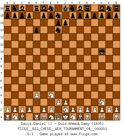 Last move : 0-1 2010 September 8 23:27:13 [Event "FICGS__BIG_CHESS__WCH_TOURNAMENT_04__000001"] [Site "FICGS"] [Date "2010.07.11"] [Round "1"] [White "Davis,Daniel"] [Black "Ould Ahmed,Samy"] [Result "0-1"] [WhiteElo ""] [BlackElo "1605"] 1.e2-e4 j15-h13 2.p1-o3 h16-o10 3.h2-g4 e15-e13 0-1 This big chess game has been lost on time (started : 2010.07.11 1:15:6) Follow this game move after move (download)The passion for playing Chess is one of the most unaccountable in the world. (H.G. Wells) Den Ruhm habe ich schon, jetzt brauche ich noch das Geld. (Wilhelm Steinitz) El Ajedrez es realmente noventa y nueve por ciento calculación. (Soltis) Votre seul travail dans les ouvertures est d'obtenir un milieu de partie jouable. (Lajos Portish) Creativity involves breaking out of established patterns in order to look at things in a different way. (Edward De Bono)